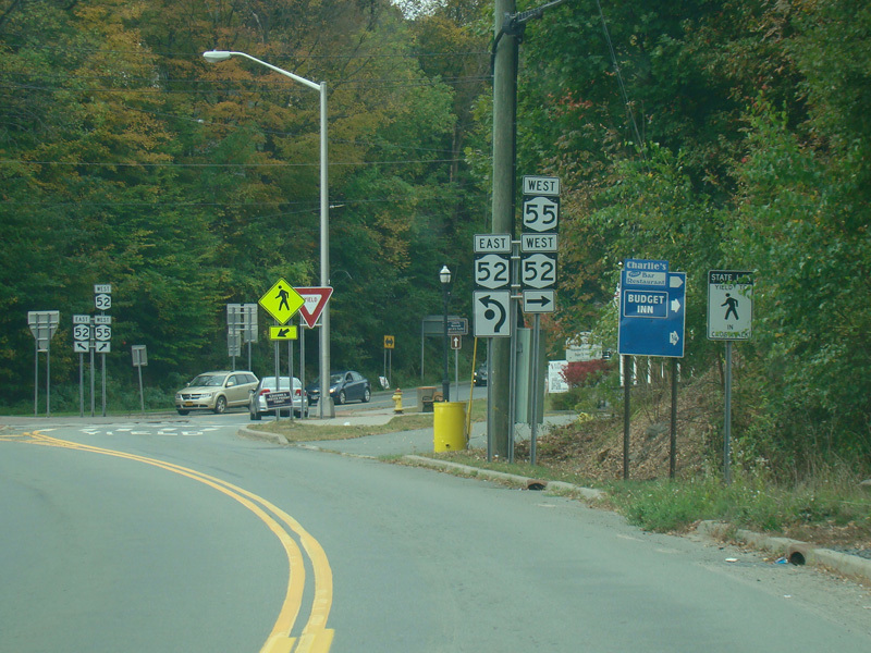 Neversink Road ends at a traffic circle at Mill Street (NY 52). Bear right to go west and to stay on NY 55. Proceed around the circle to go east.