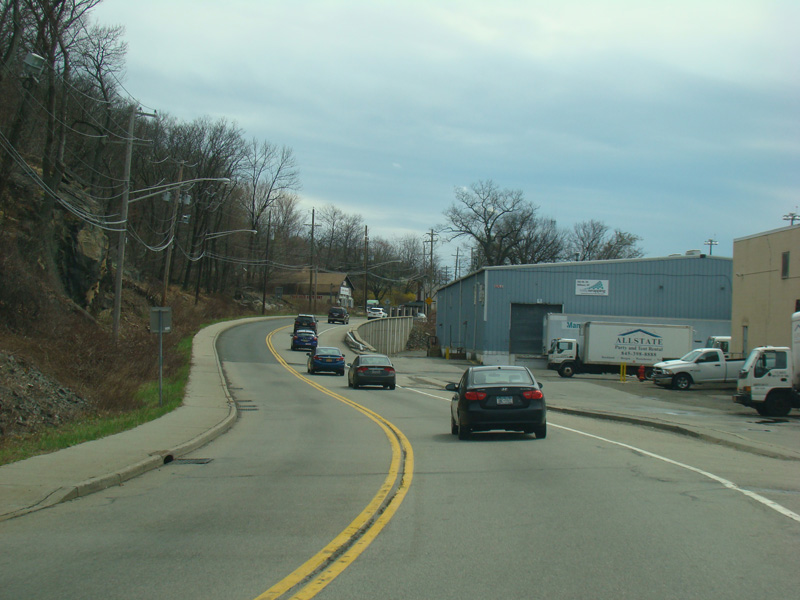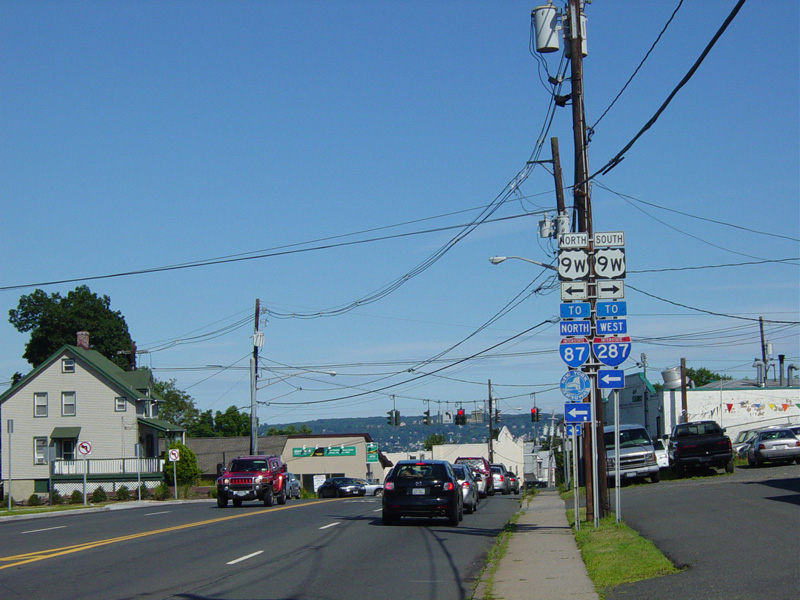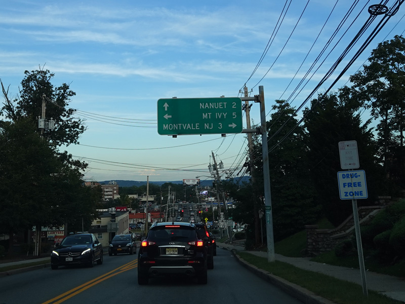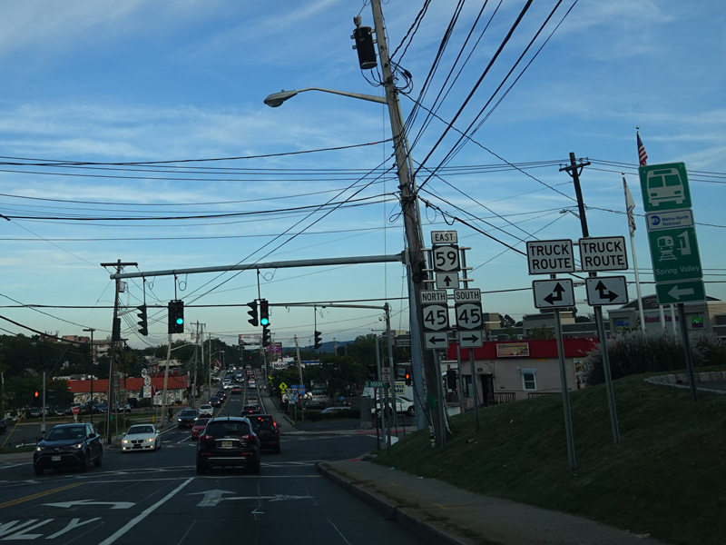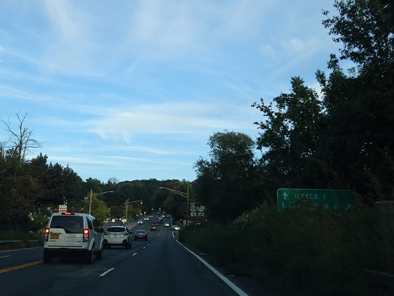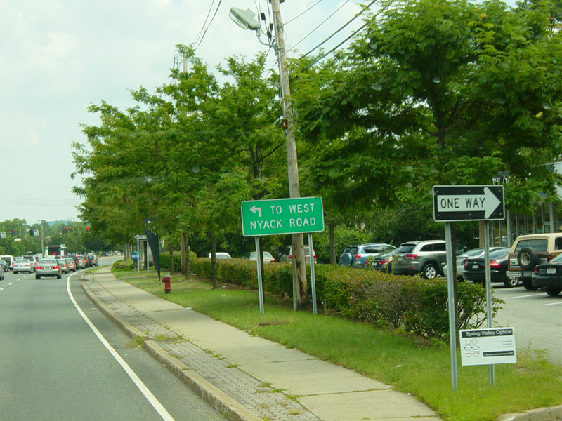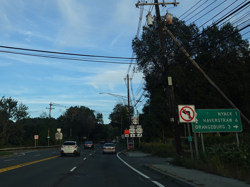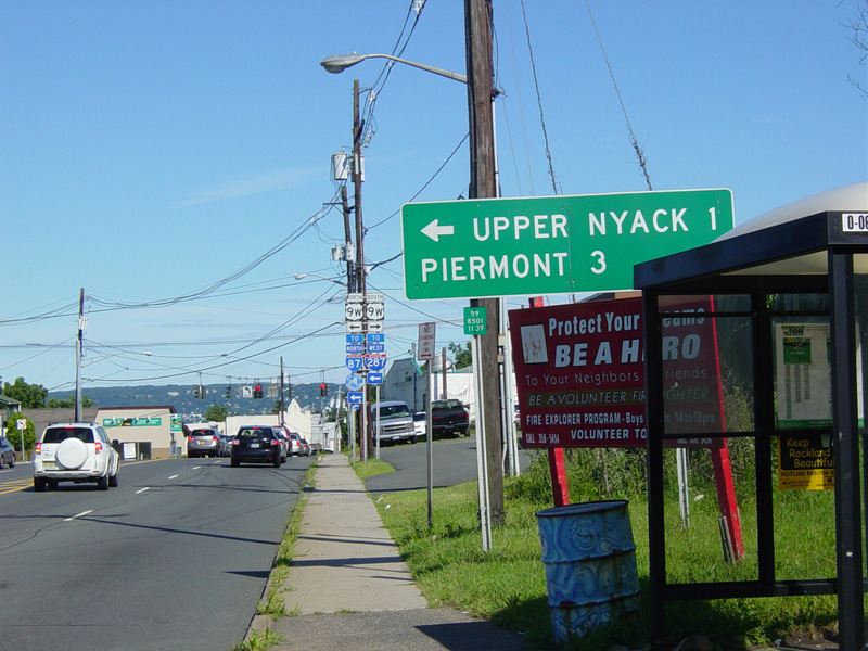 Welcome to the Village of Nyack! NY 59 passes under the New York Thruway (I-87/I-287) and then ends at US 9W. There is a traffic light at the eastern terminus. Turn left to go north or turn right to go south. There is an entrance to the Thruway from US 9W one block north of here. Main Street is straight ahead.