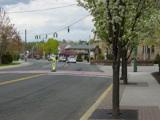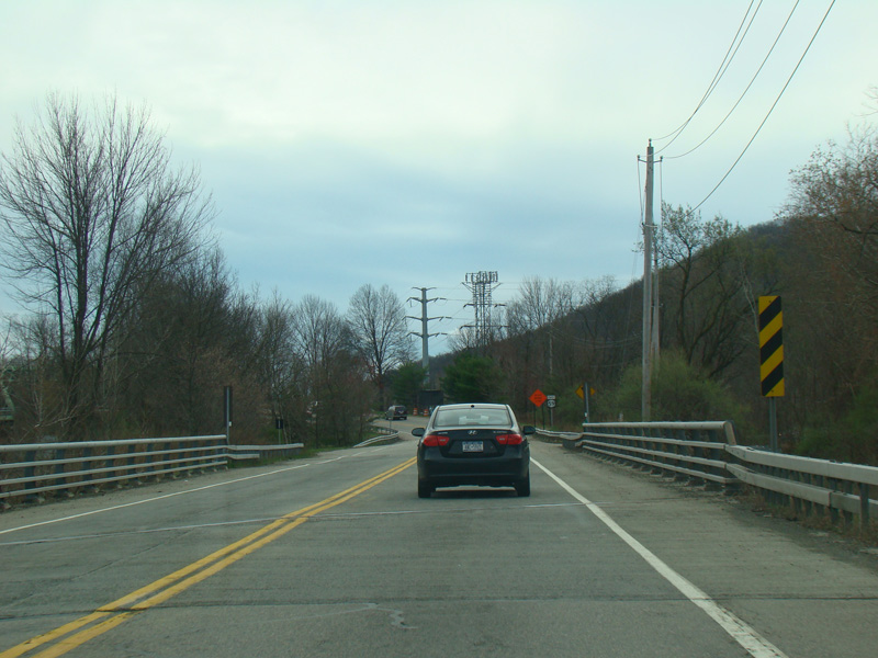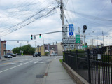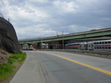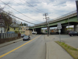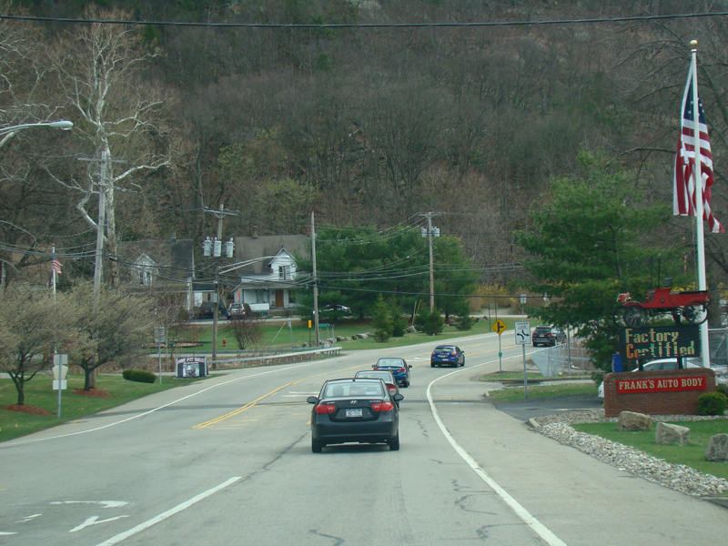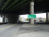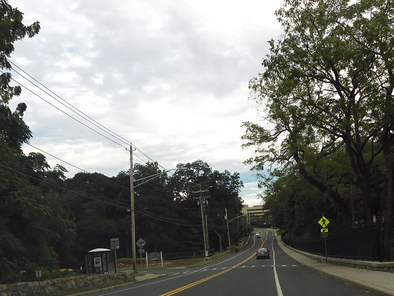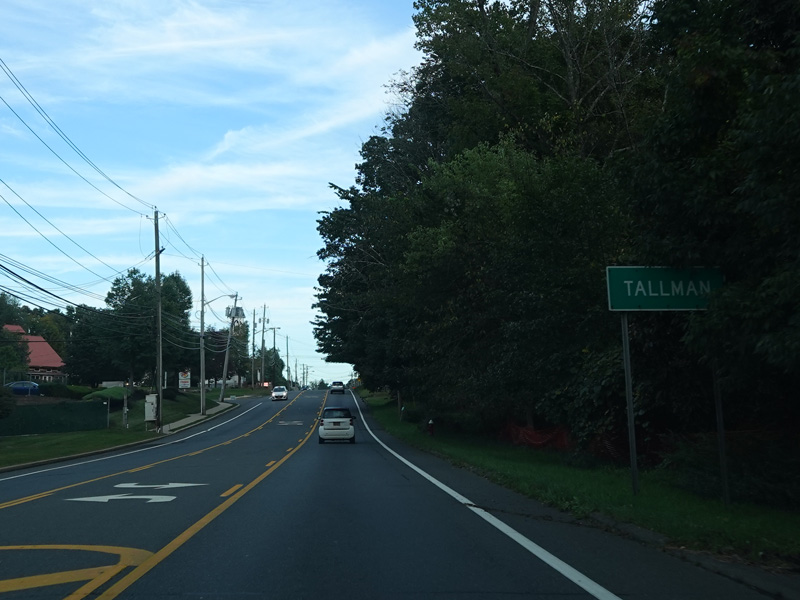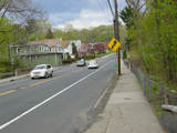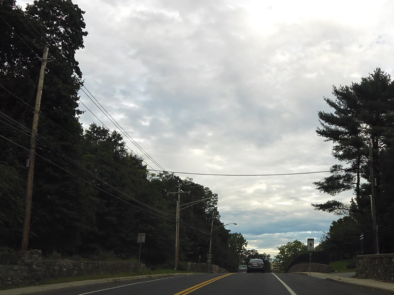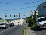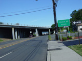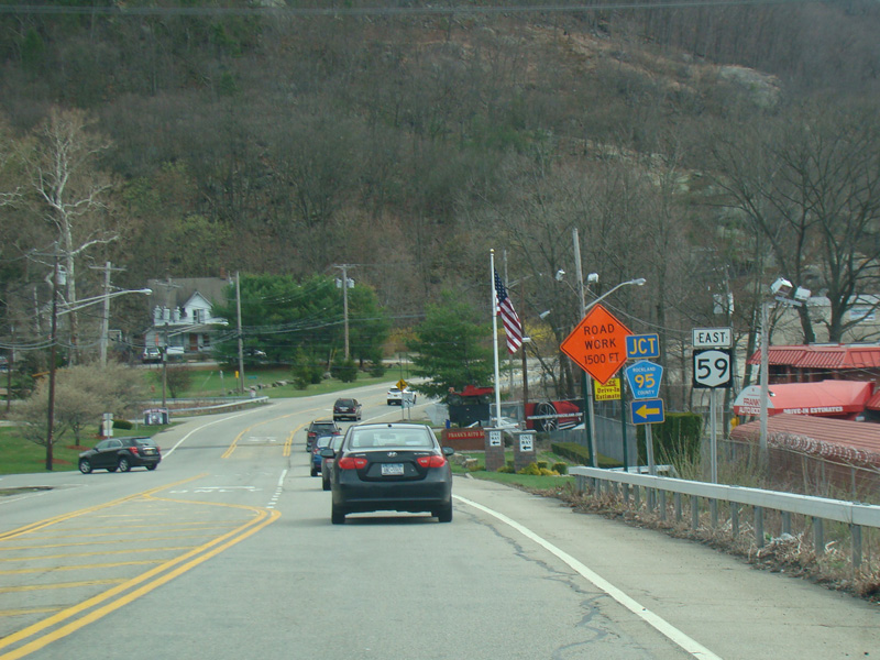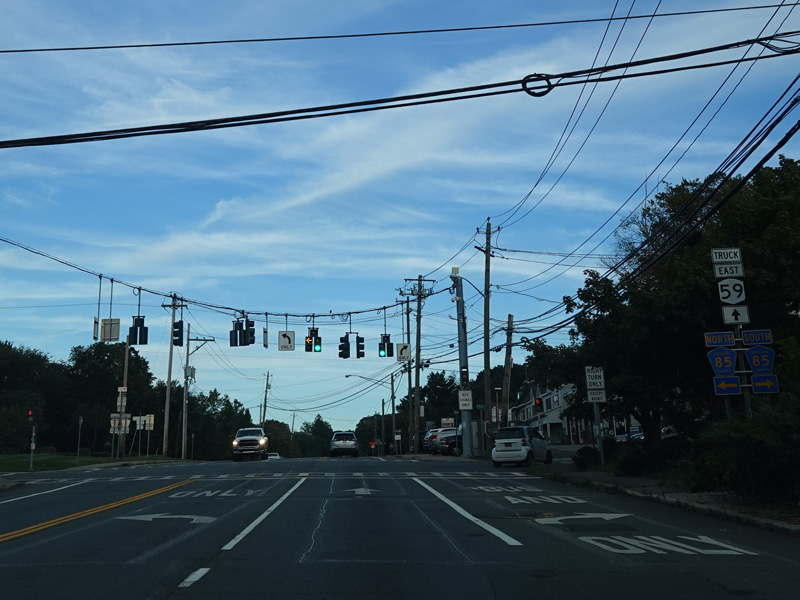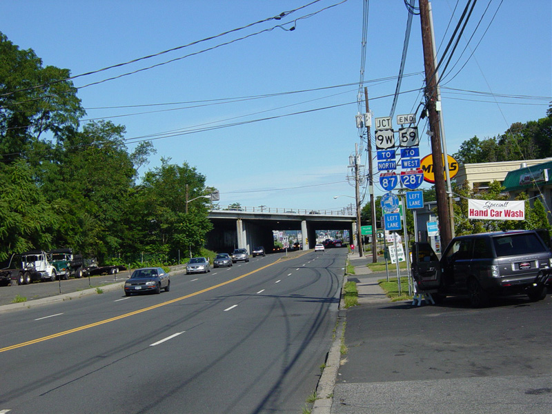 Welcome to the Village of Nyack! NY 59 passes under the New York Thruway (I-87/I-287) and then ends at US 9W. There is a traffic light at the eastern terminus. Turn left to go north or turn right to go south. There is an entrance to the Thruway from US 9W one block north of here. Main Street is straight ahead.