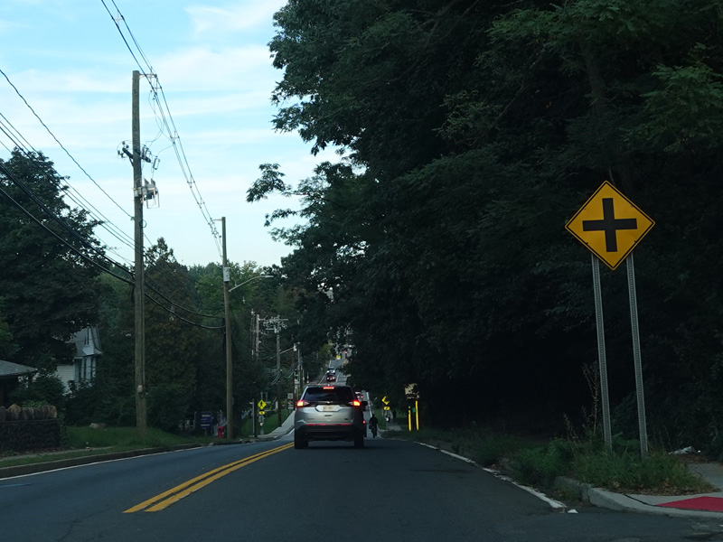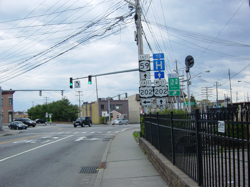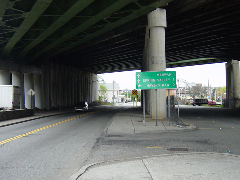 Orange Avenue passes under the New York Thruway (I-87/I-287), but there is no interchange. Immediately after the underpass, there is a traffic light at US 202. Turn left onto Wayne Avenue to go east on US 202. Straight ahead, westbound US 202 is multiplexed with eastbound NY 59.