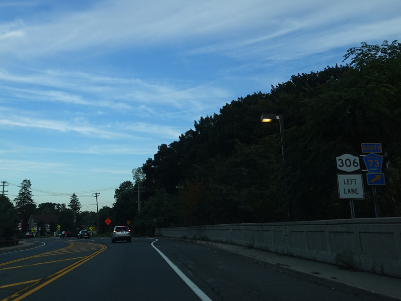 NY 306 begins on the left at a traffic light. Saddle River Road (CR 73) begins on the right.