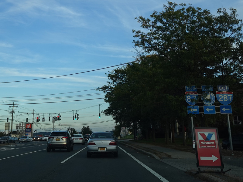 There is a southbound entrance to the New York Thruway (I-87/I-287) on the left at this traffic light.