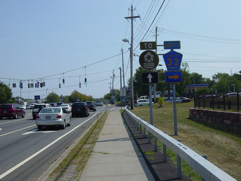 These signs were found on NY 59 at Middletown Road (CR 33) in Nanuet. They have been replaced with new ones that use mixed-case lettering for the Palisades Parkway.