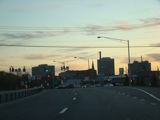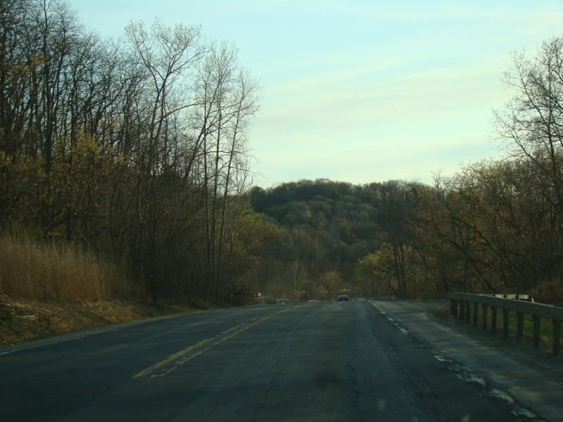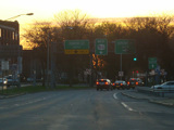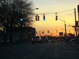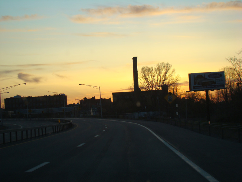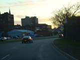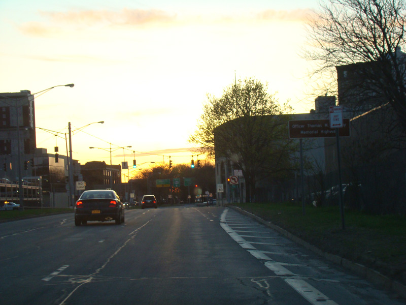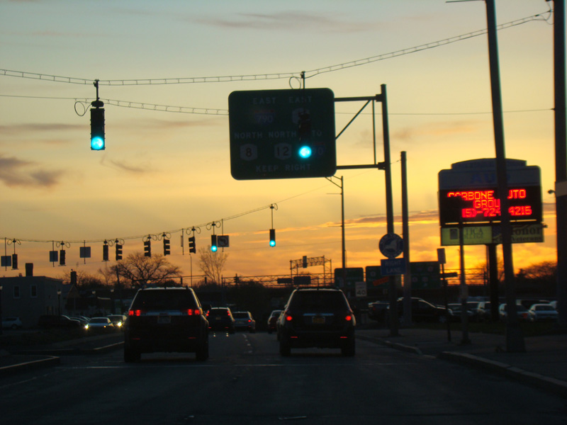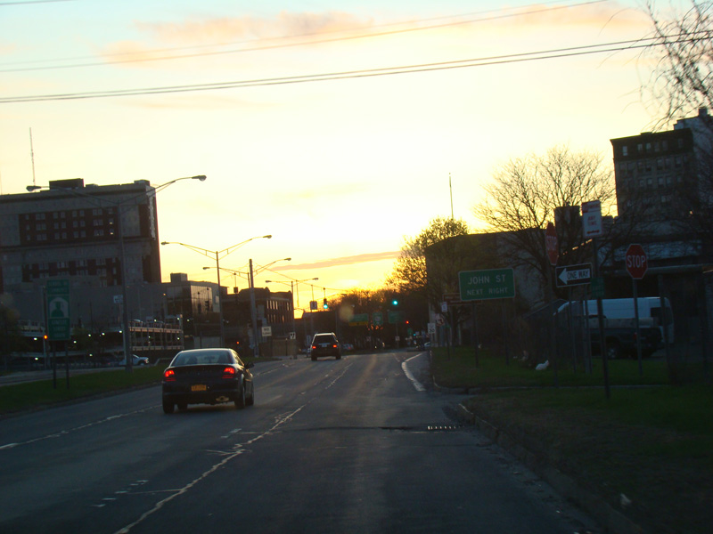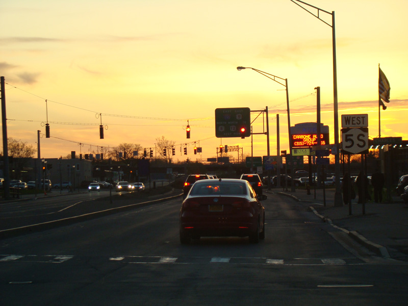 The arterial peters out, and NY 5S turns into Oriskany Street East, a six-lane divided boulevard with traffic lights.