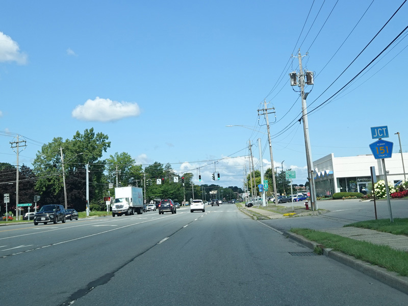 Albany Shaker Road (CR 151) begins on the left at a traffic light.
