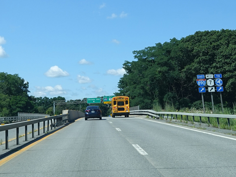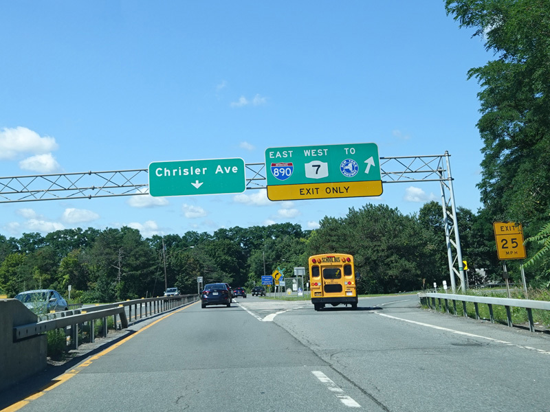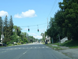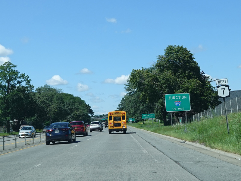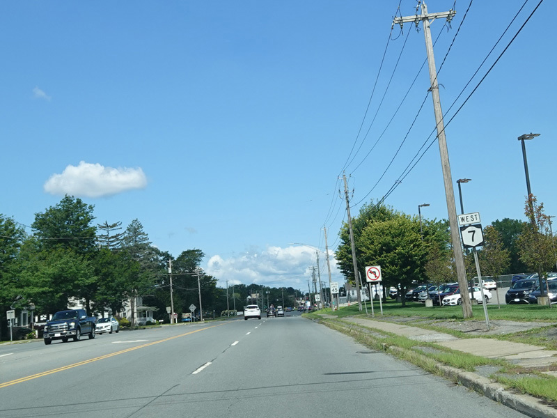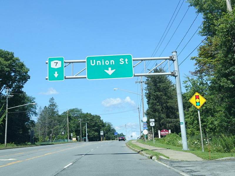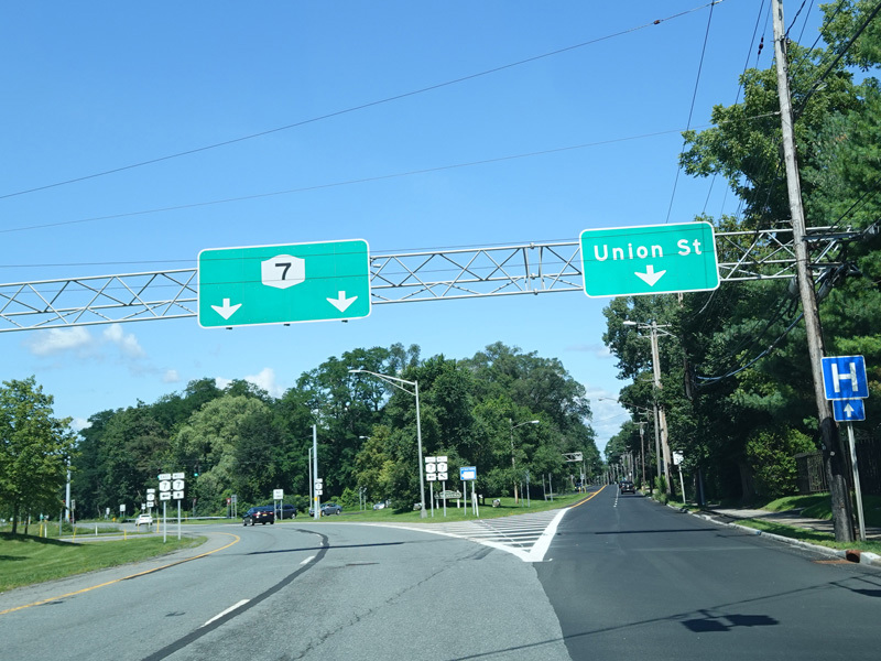 The roadway splits. Bear right for Union Street, which begins here. Bear left to stay on NY 7. Union Street becomes part of NY 146 a few blocks west of here, but there is no signage to indicate so at this intersection.
