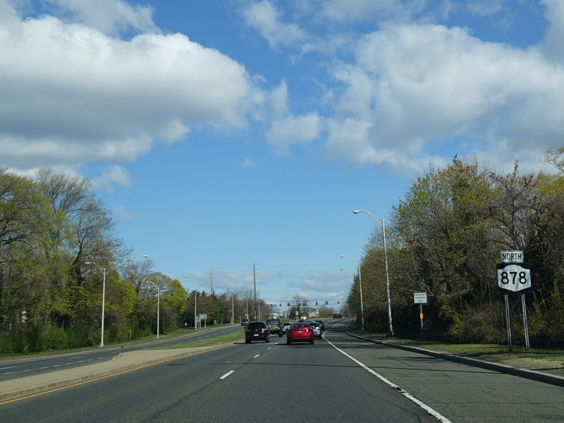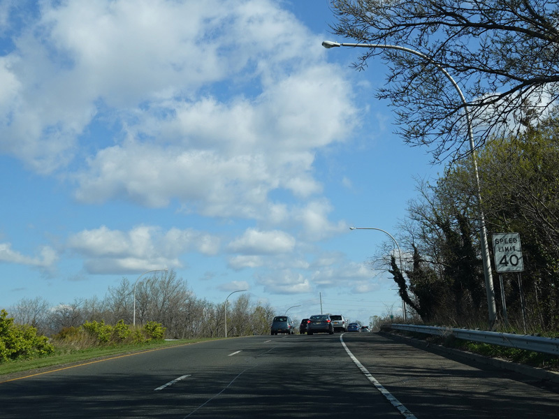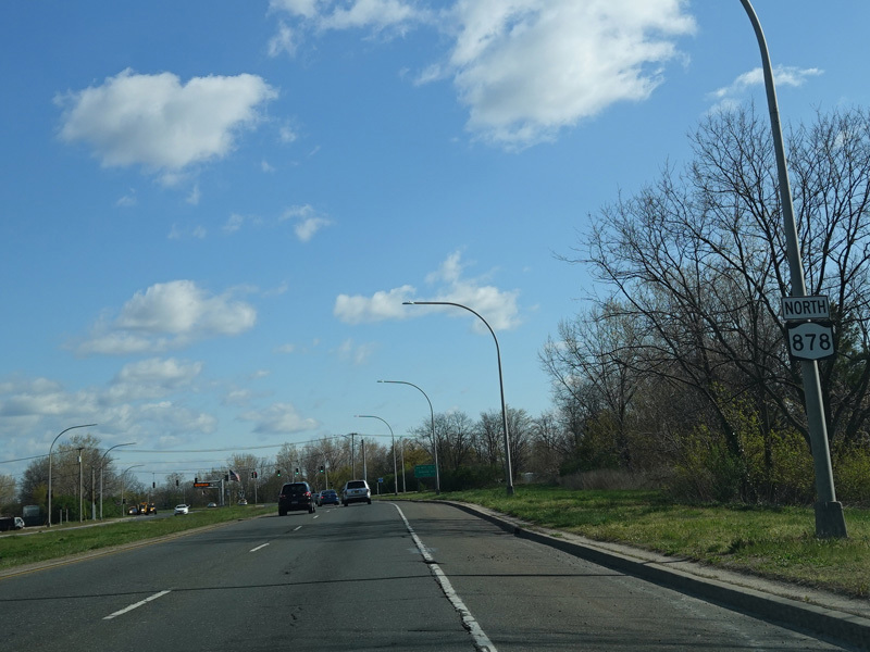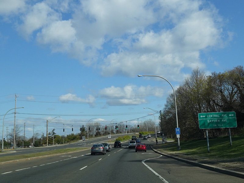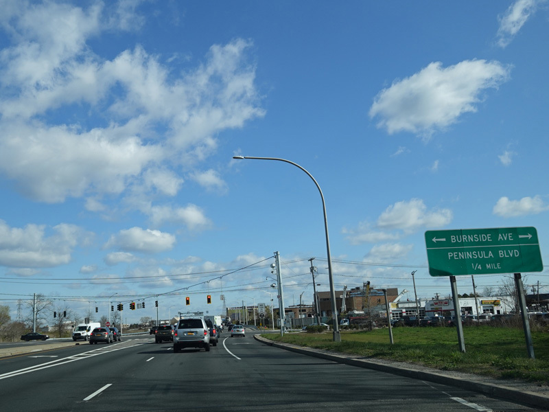 The median ends here. The northern tip of the Nassau Expressway is an undivided road that is locally maintained by the Nassau County Department of Public Works. Turn right at the traffic light for Bay Boulevard (CR 2A), which becomes Peninsula Boulevard (CR 2) one block east of here.