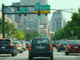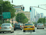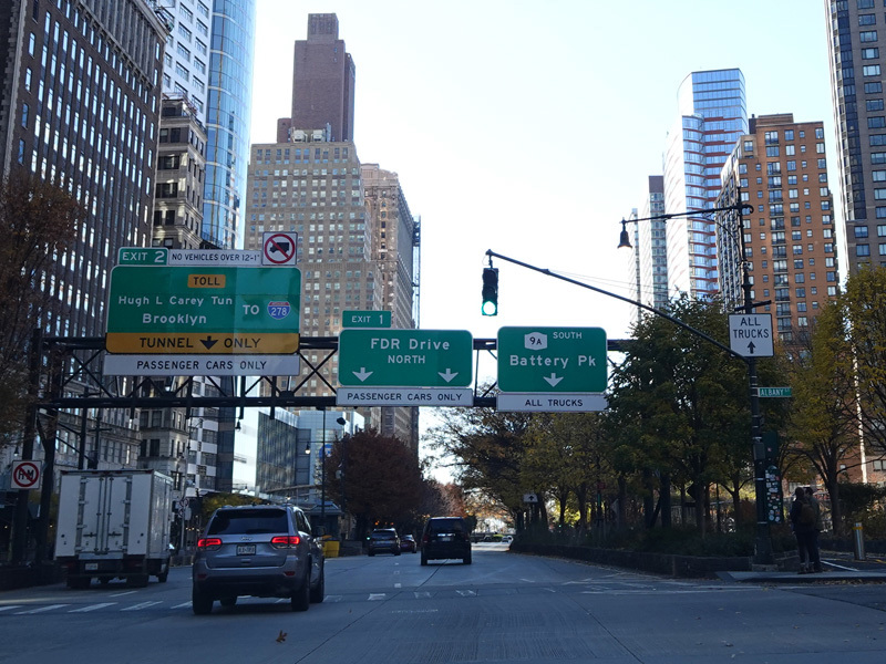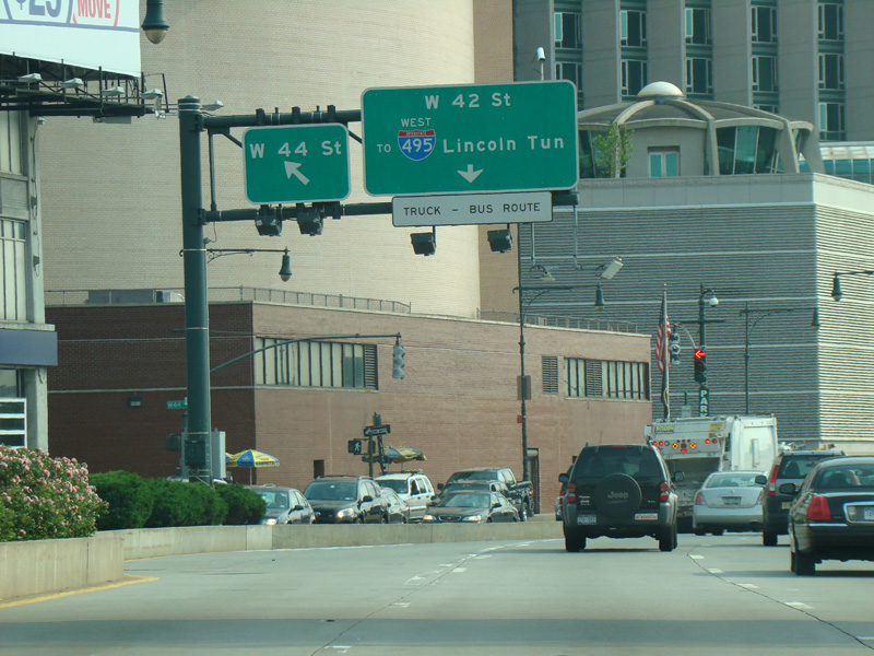 NY 9A is routed along 12 Avenue, a large divided boulevard that is the westernmost north/south route in Manhattan. There are green signs informing motorists where they can turn left. This is the case at every other block because most streets in Manhattan are one-way. At West 42 Street, there is access to the Lincoln Tunnel (NY 495). Although the tunnel is designated a state route in both New York and New Jersey, signs on the New York side of the border mark it as an interstate. All trucks and buses using the tunnel must exit here.