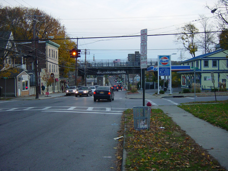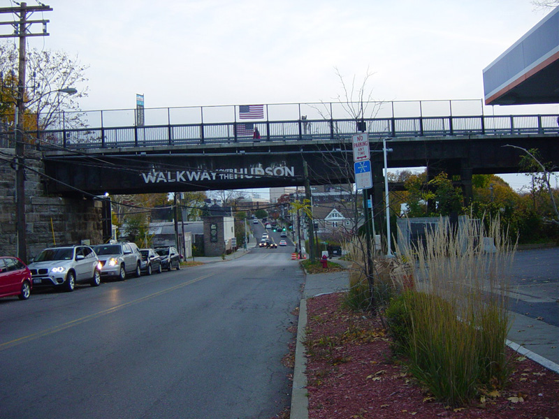 Washington Street passes under the Walkway Over the Hudson, an old railroad bridge over the Hudson River that has been converted into a pedestrian bridge.