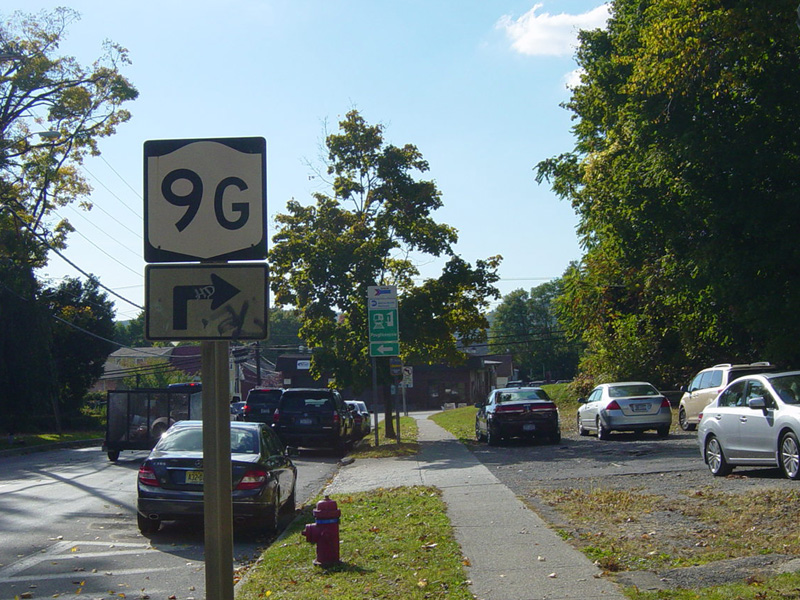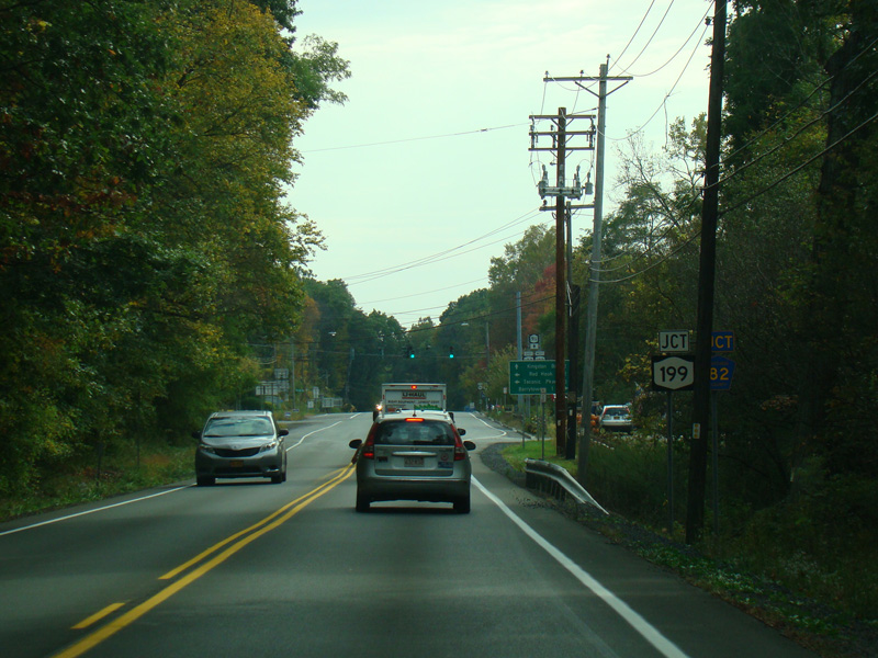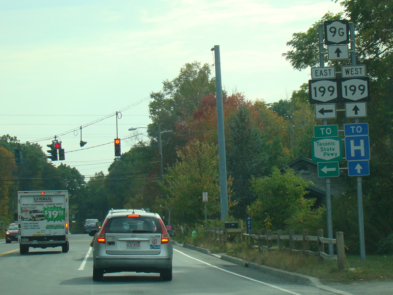 There is a traffic light at NY 199. Turn left to go east. Continue straight ahead to go west and to stay on NY 9G.
