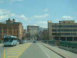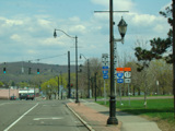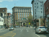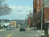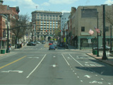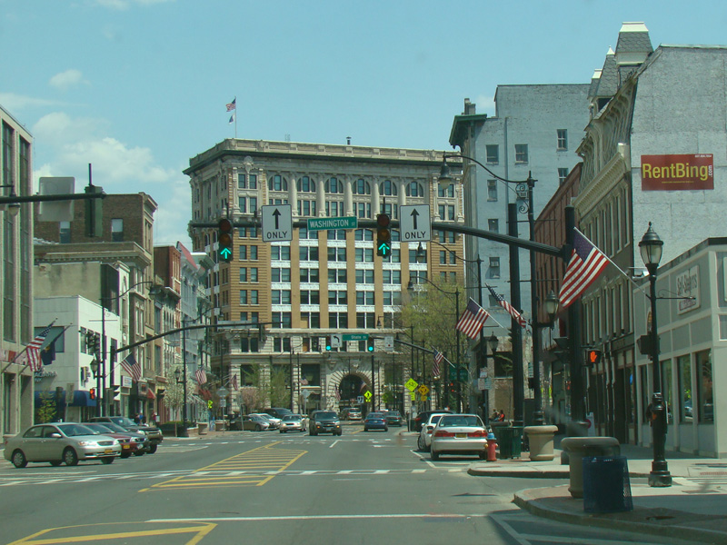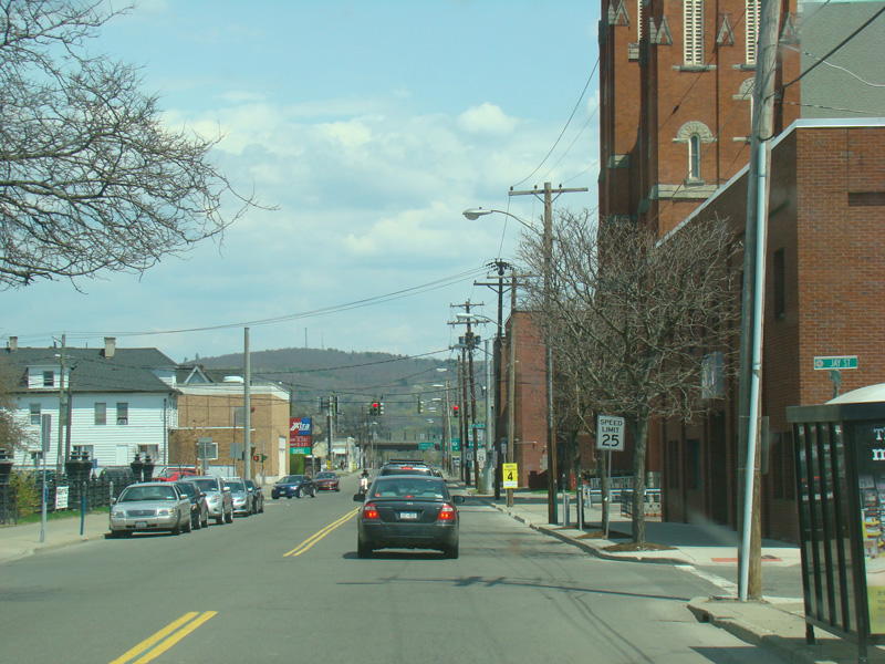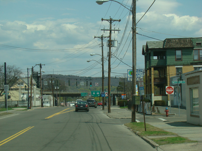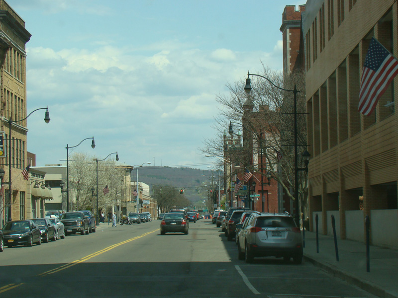 Court Street runs east through Binghamton as a two-lane undivided road. There are traffic lights at Washington Street and State Street (NY 434), followed by a traffic circle. There is no route signage for NY 434 here.