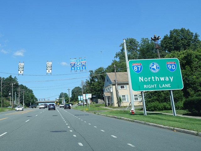 Heading out of the Buffalo area, US 20 turns east and crosses the state, running south of and parallel to the New York Thruway (I-90). It passes along the northern tips of the Finger Lakes and avoids major cities such as Rochester, Syracuse, and Utica. When it reaches Albany, US 20 does actually enter the city. There, it joins US 9 and crosses the Dunn Memorial Bridge across the Hudson River. On the other side, the two routes are multiplexed for a few miles, and then US 9 splits off to continue south toward New York City. US 20 continues east to the state line, where it continues into Massachusetts.