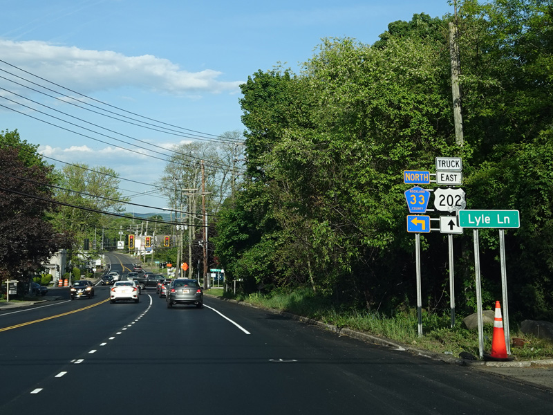 There is a traffic light at South Central Highway (CR 33). Turn right to go south. Straight ahead, northbound CR 33 is multiplexed with US 202.
