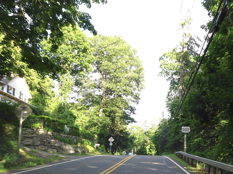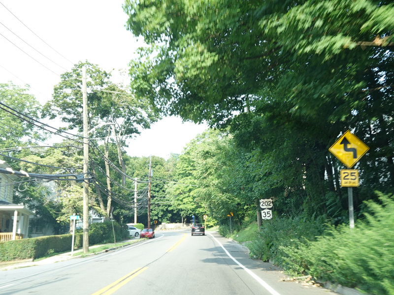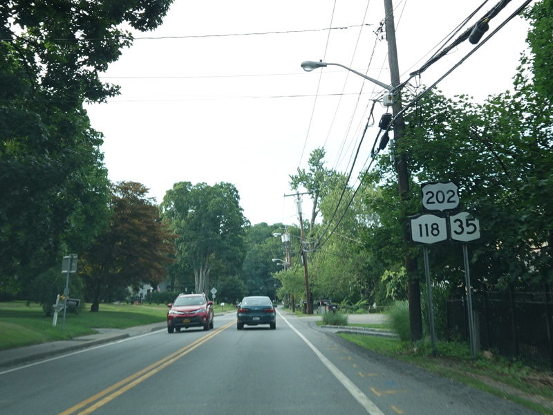 Saw Mill River Road ends at a traffic light. Turn left onto Tomahawk Street to stay on US 202/NY 118. NY 35 splits off straight ahead as Amawalk Road.