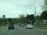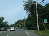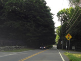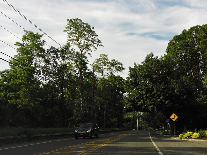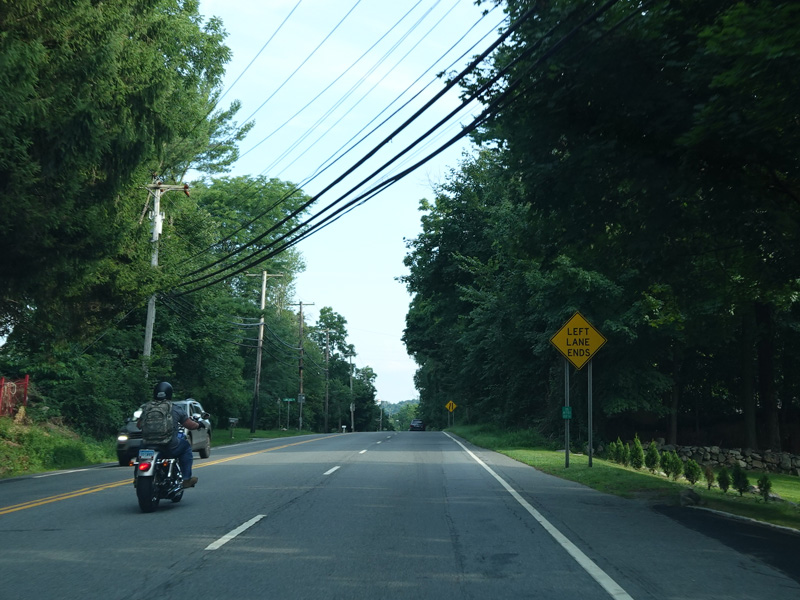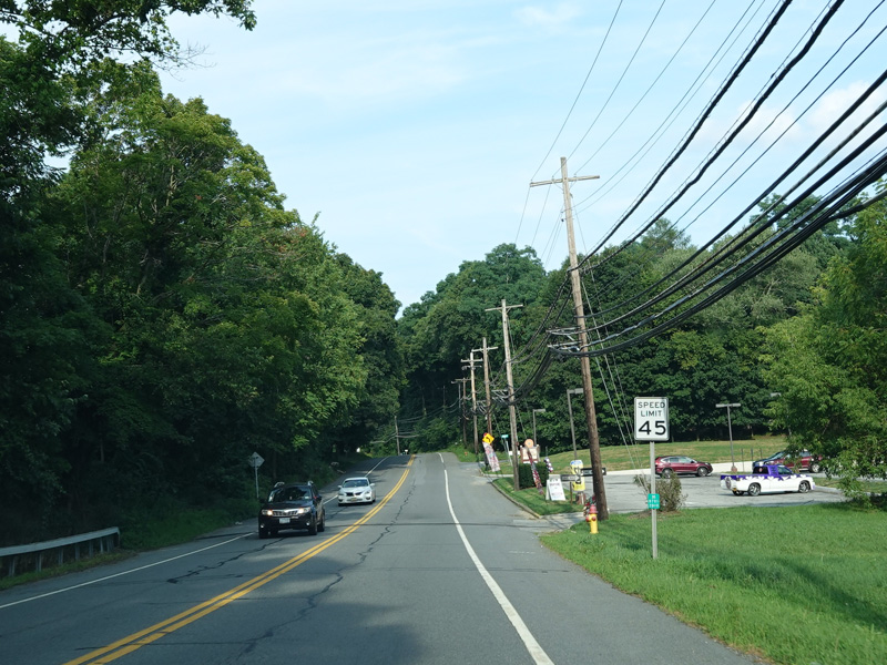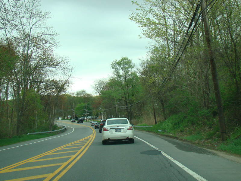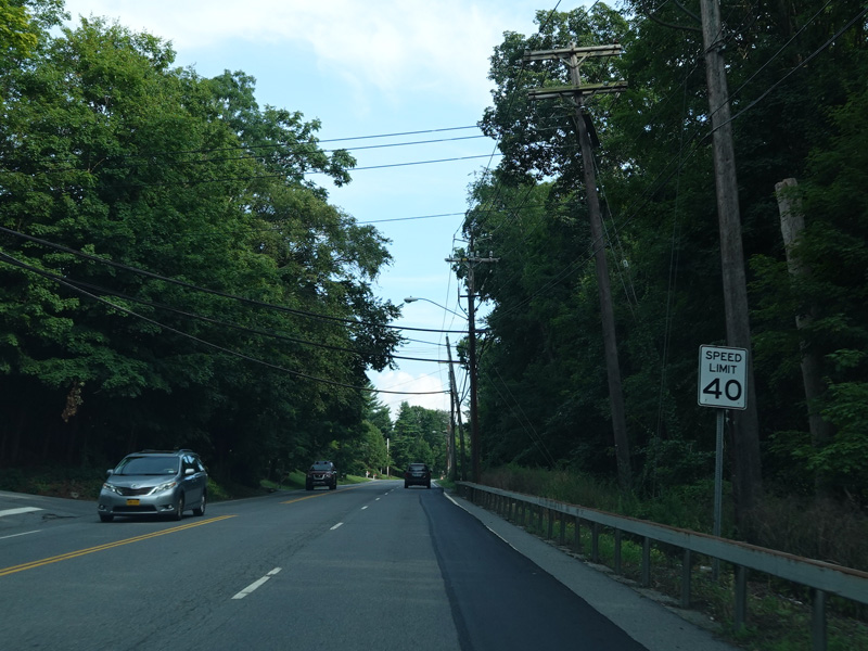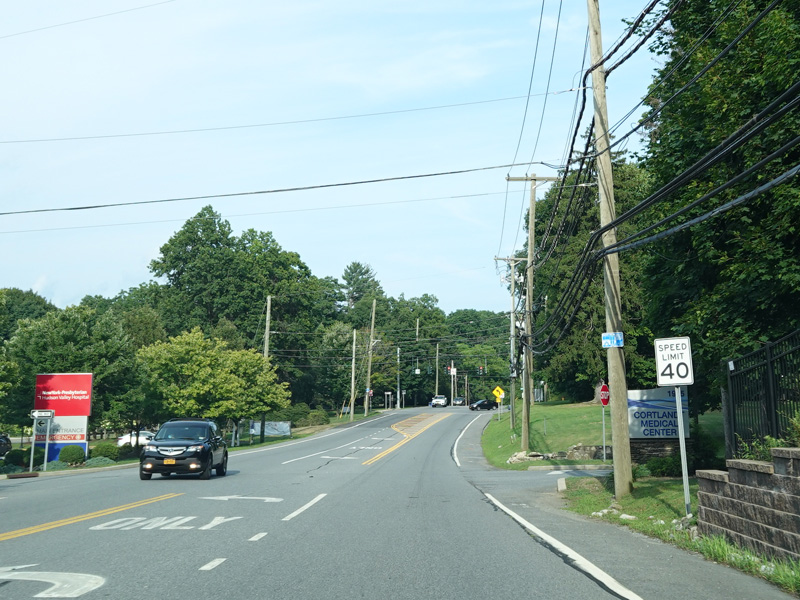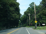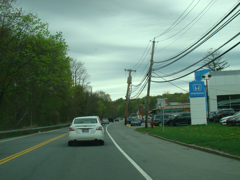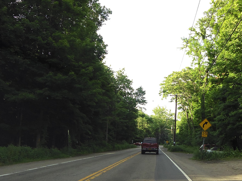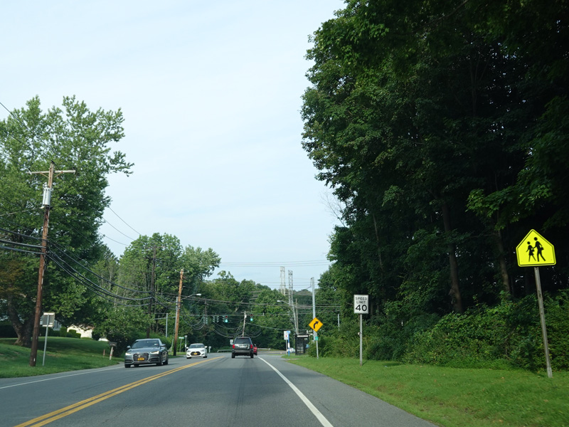 Crompond Road widens to four lanes. The eastern section of the Bear Mountain Parkway begins on the left at an uncontrolled intersection.