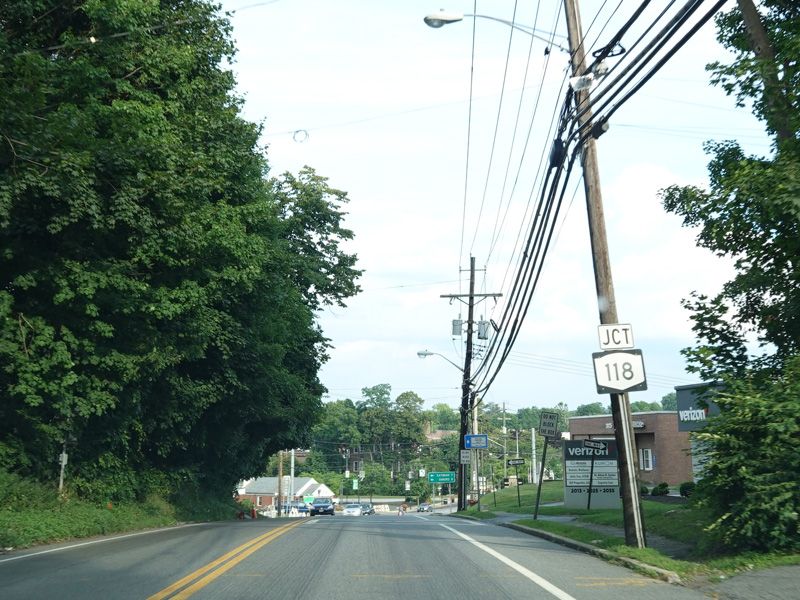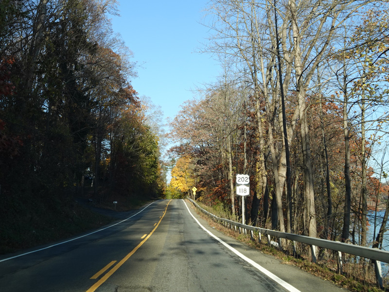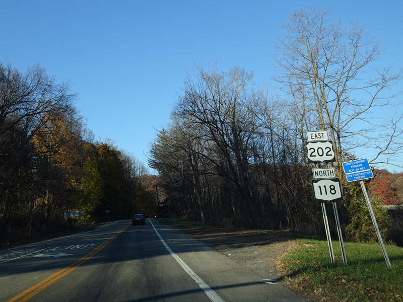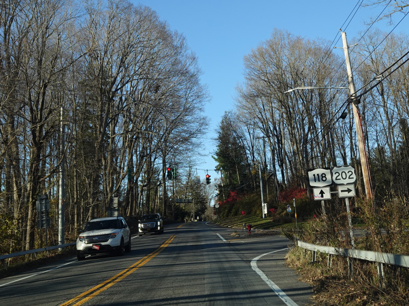 The two routes split at a traffic light. Turn right onto Lincolndale Road to stay on US 202. Continue straight ahead on Tomahawk Street for NY 118.