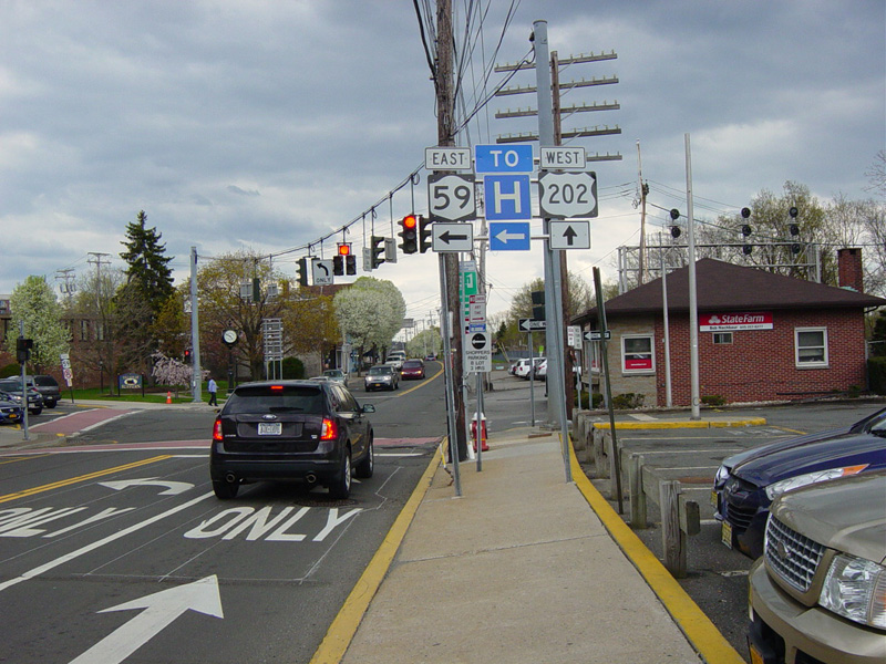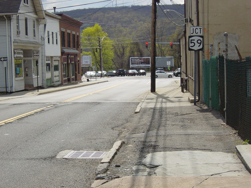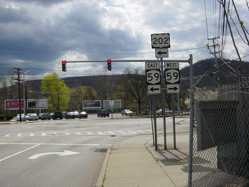 Wayne Avenue ends here at Orange Avenue (NY 59). Turn left to go east or right to go west. US 202 is multiplexed with NY 59 along Orange Avenue to the left.