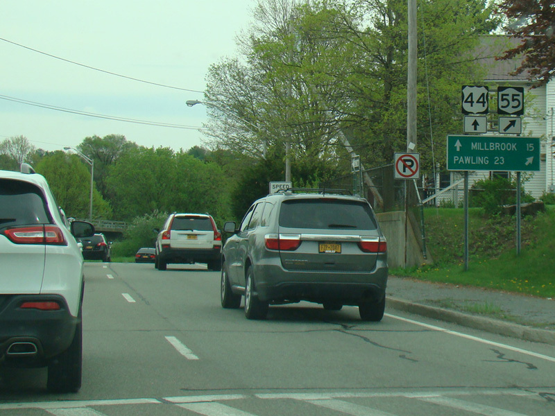 In Poughkeepsie, US 44/NY 55 is routed along a pair of parallel one-way streets. Eastbound traffic follows Church Street, which eventually changes names to become Baker Street, while westbound traffic follows Mill Street.