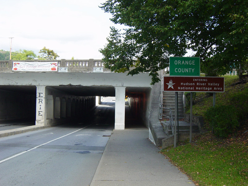 US 6/US 209 passes through a tunnel under the Port Jervis Line of the Metro-North Railroad. There are signs welcoming motorists to the City of Port Jervis and Orange County, but there is still no mention of New York State.
