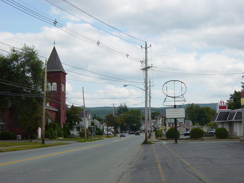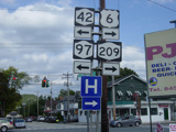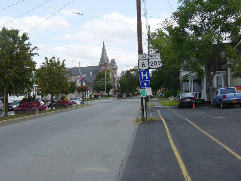 Pike Street ends at this traffic light. Turn right onto East Main Street to stay on US 6/US 209. Turn left for West Main Street (NY 42/NY 97). There is a sign goof here. This is US 209, not NY 209.