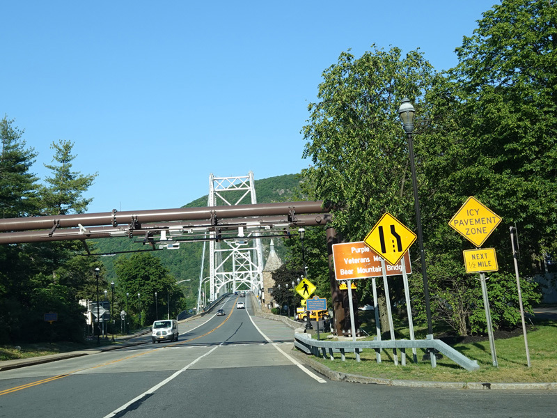 At the end of the parkway, US 202 joins US 6. There is a cashless tolling gantry crossing the Bear Mountain Bridge.