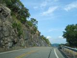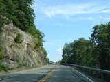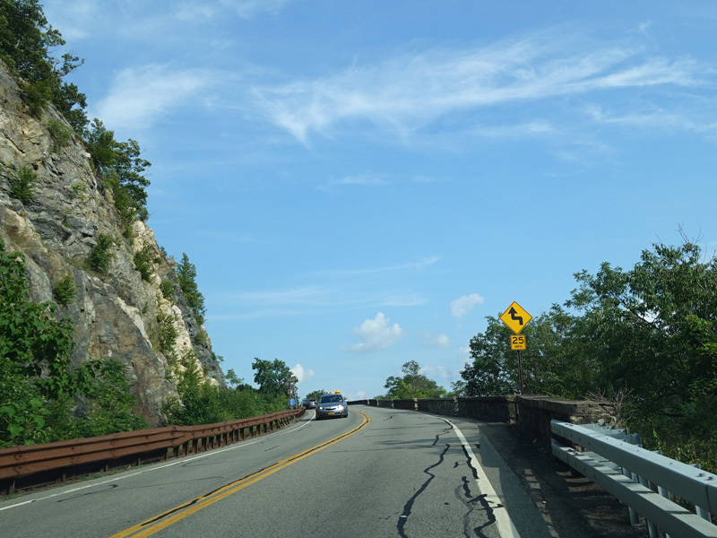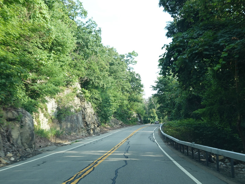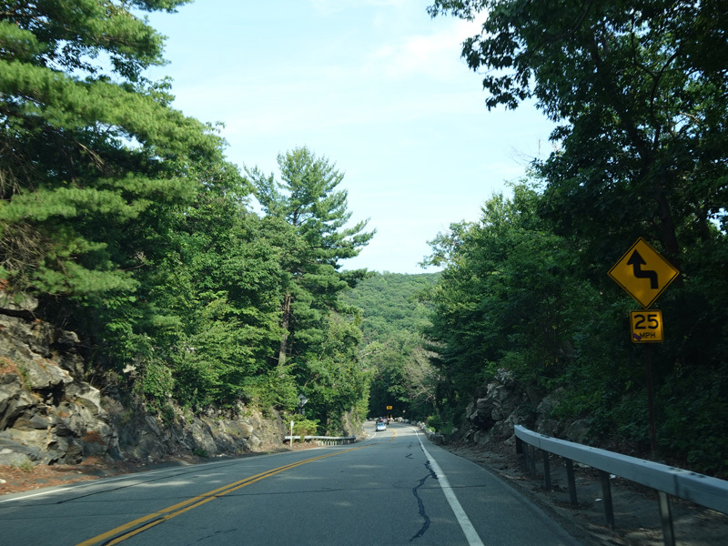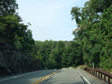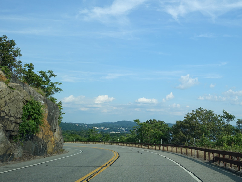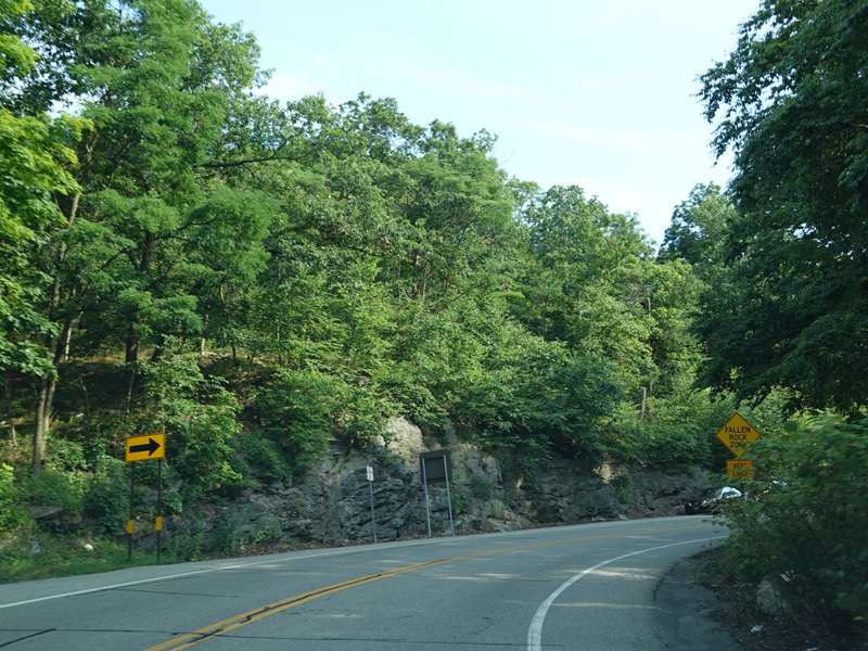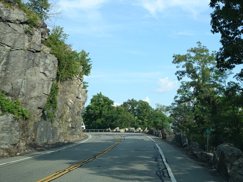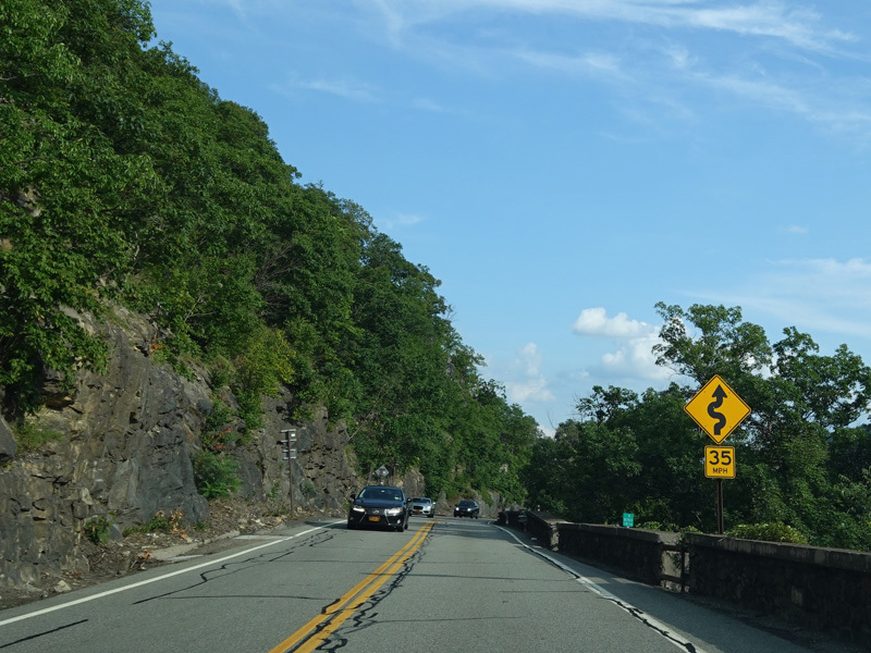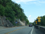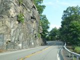 Bear Mountain Bridge Road is informally known to locals at the "goat path" because it runs along the edge of a cliff by the river. The terrain along this stretch is very rocky. There are a couple of sign goofs where US 202 is erroneously marked as NY 202. There is a scenic area on the right.