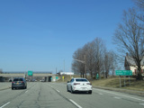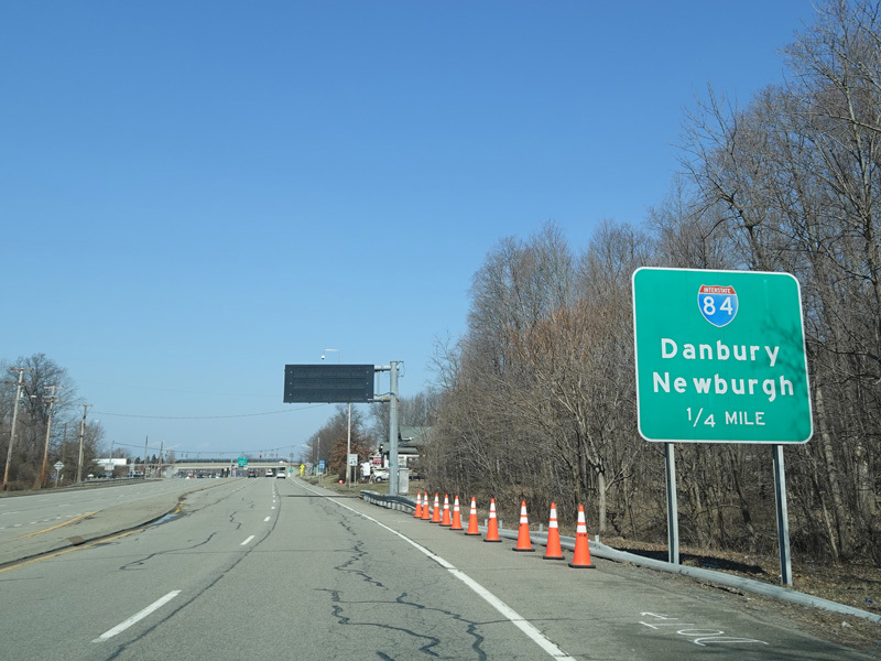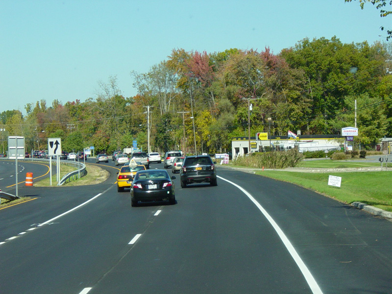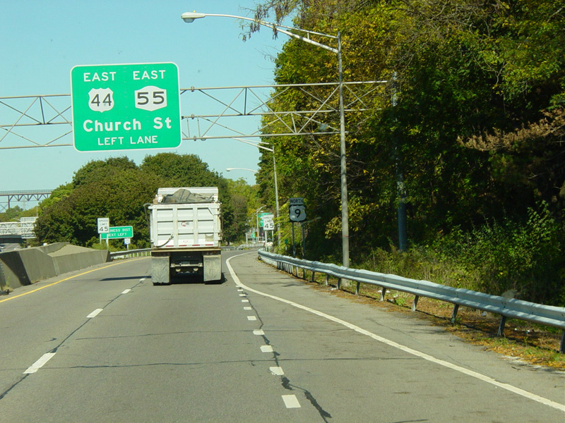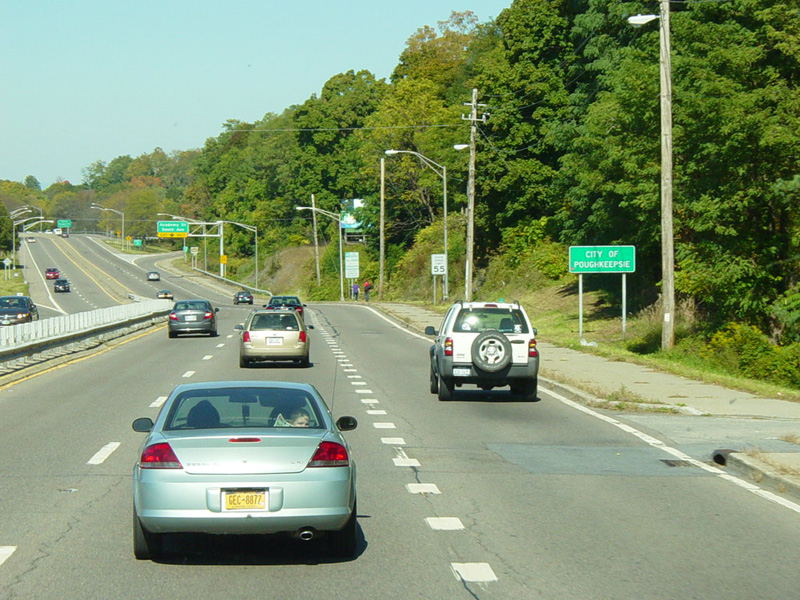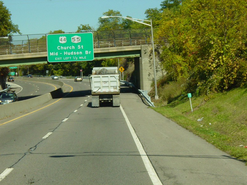 There is an interchange with US 44/NY 55, which crosses the Hudson River just west of here on the Mid-Hudson Bridge and runs east as Church Street. This interchange is somewhat unusual in that the exit to go east is only on the northbound side and the exit to go west is only on the southbound side. A pair of turnarounds is provided to make this a full interchange. There is also an exit for Main Street.
