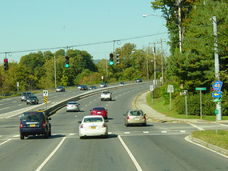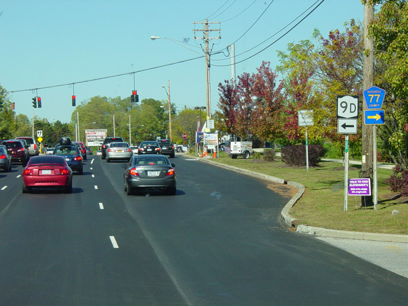 West Main Street (NY 9D) begins on the left at this traffic light. Vassar Road (CR 77) begins on the right.