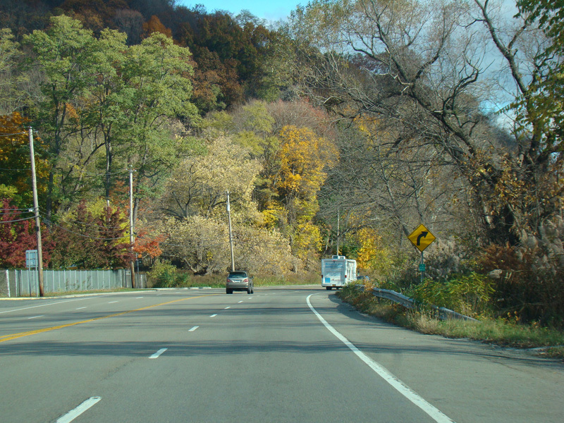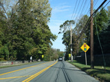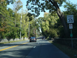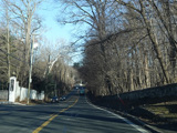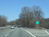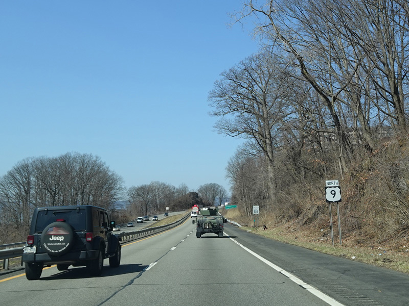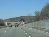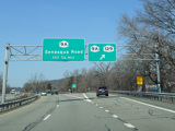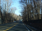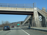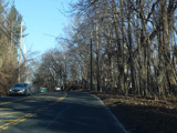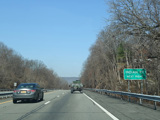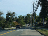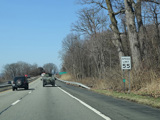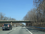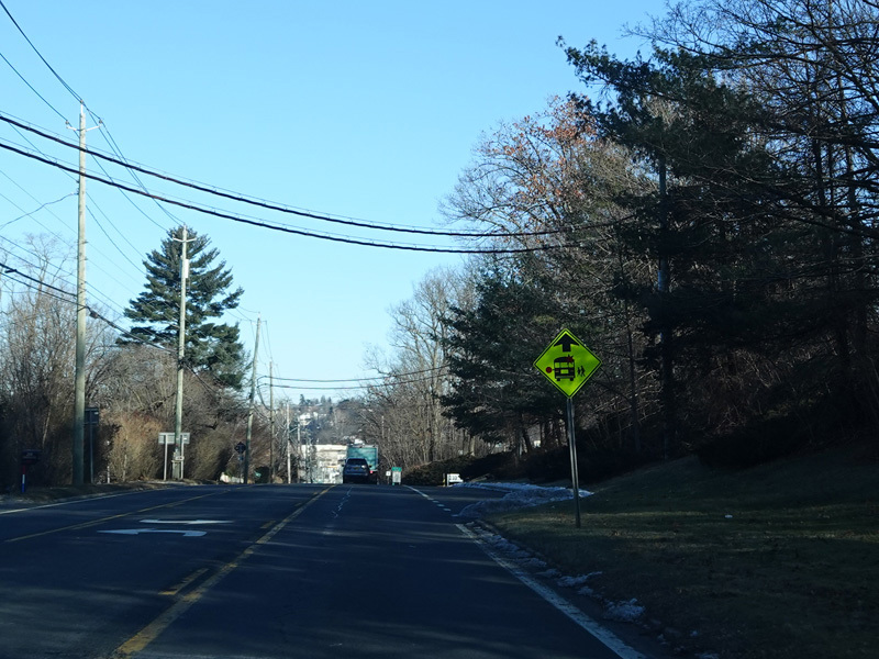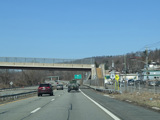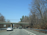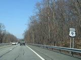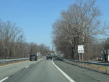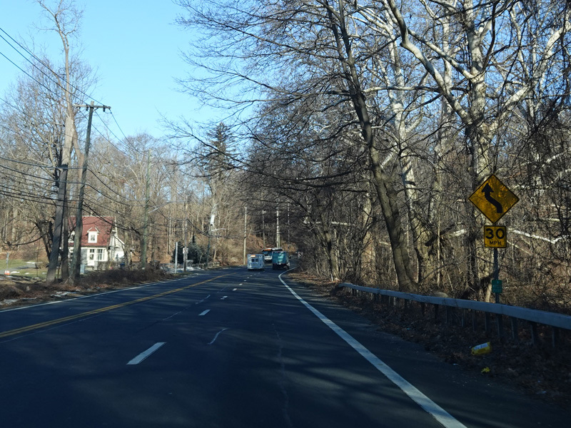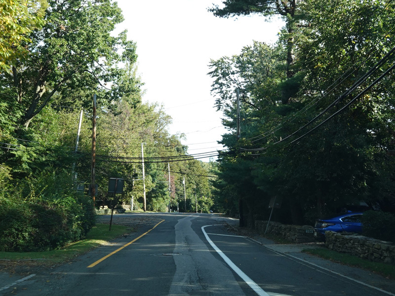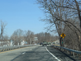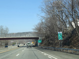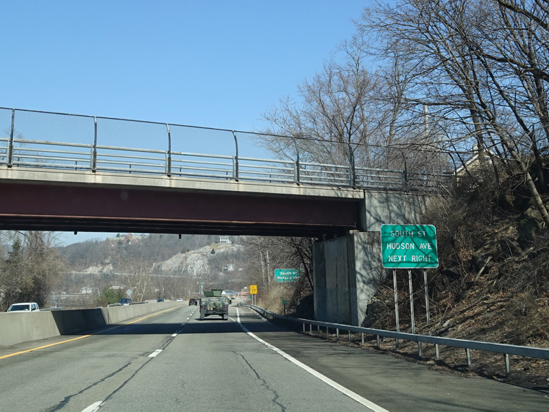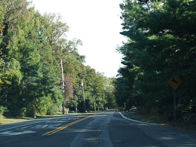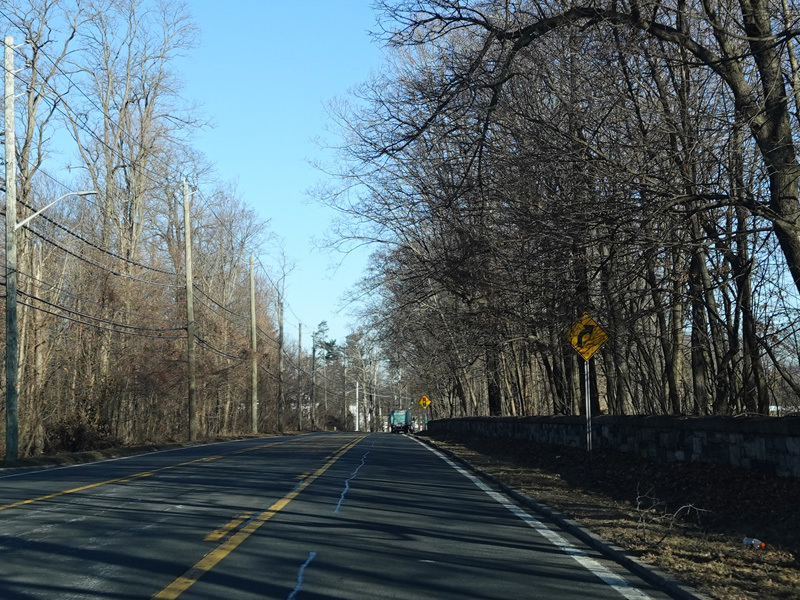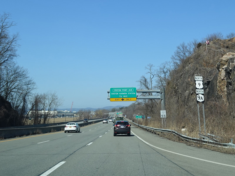 North of the interchange, US 9 is known as Albany Post Road. The northbound side has an extra lane going uphill. A pedestrian overpass carries the Old Croton Aqueduct over the road.