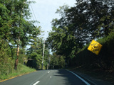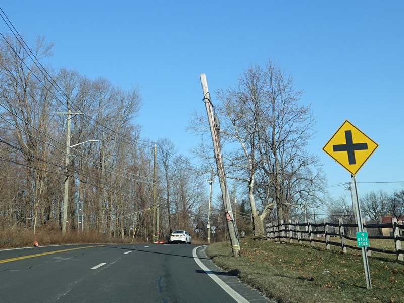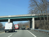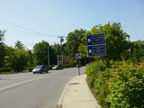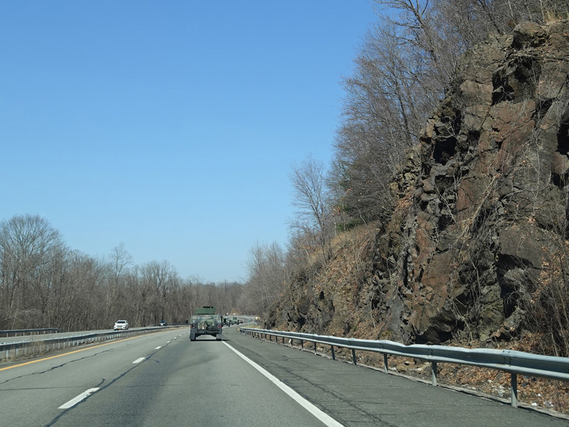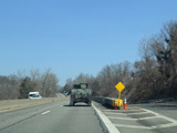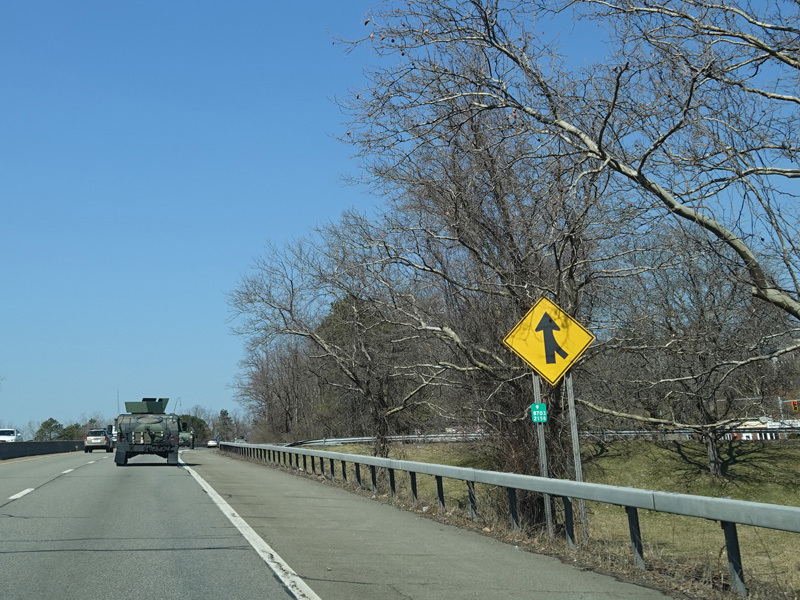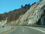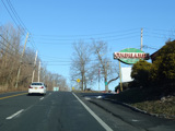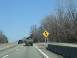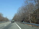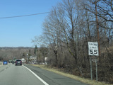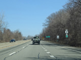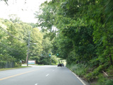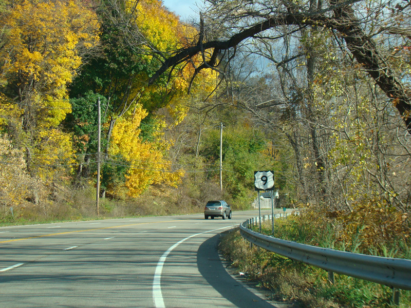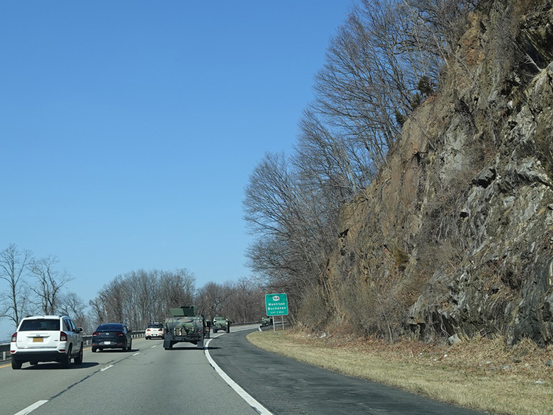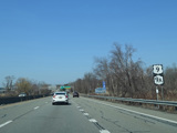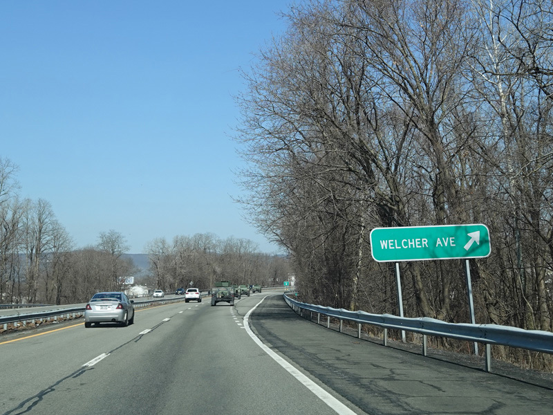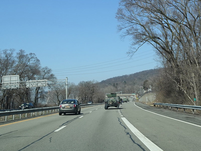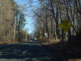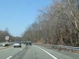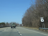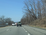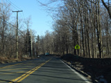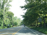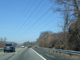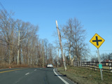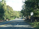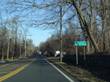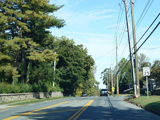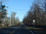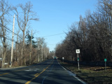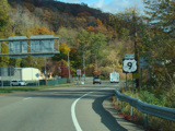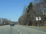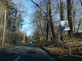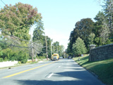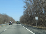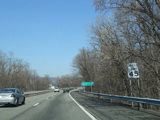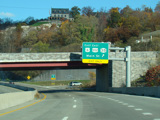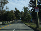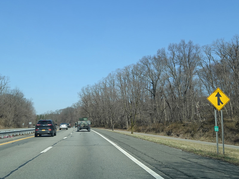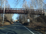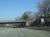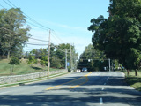North of the interchange, US 9 is known as Albany Post Road. The northbound side has an extra lane going uphill. A pedestrian overpass carries the Old Croton Aqueduct over the road.