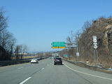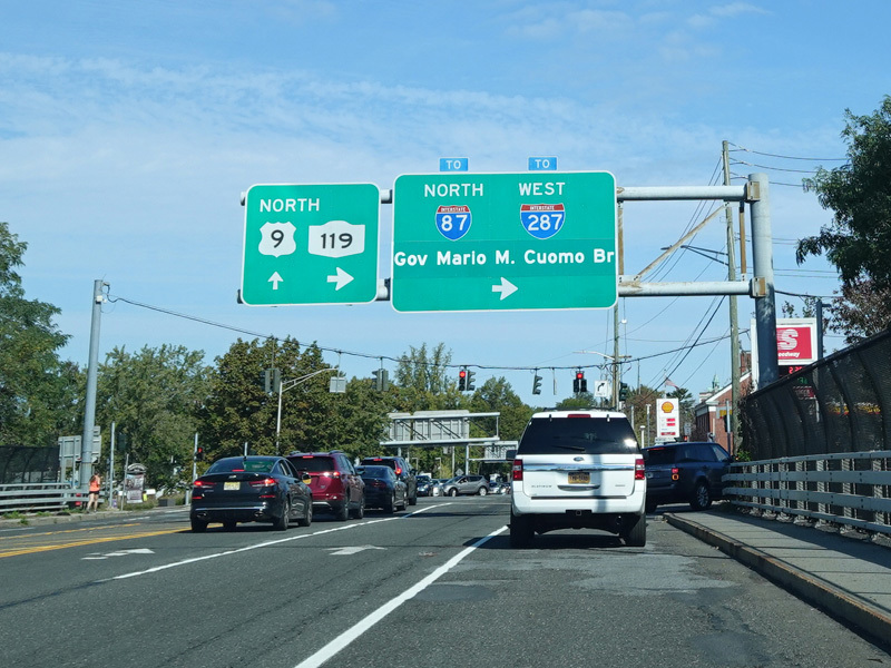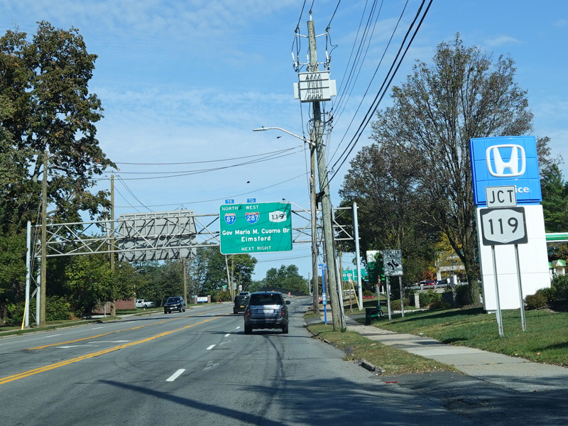 There is an interchange with the New York Thruway (I-87/I-287). White Plains Road (NY 119) begins on the right here. Turn right onto White Plains Road for an entrance to the Thruway northbound.