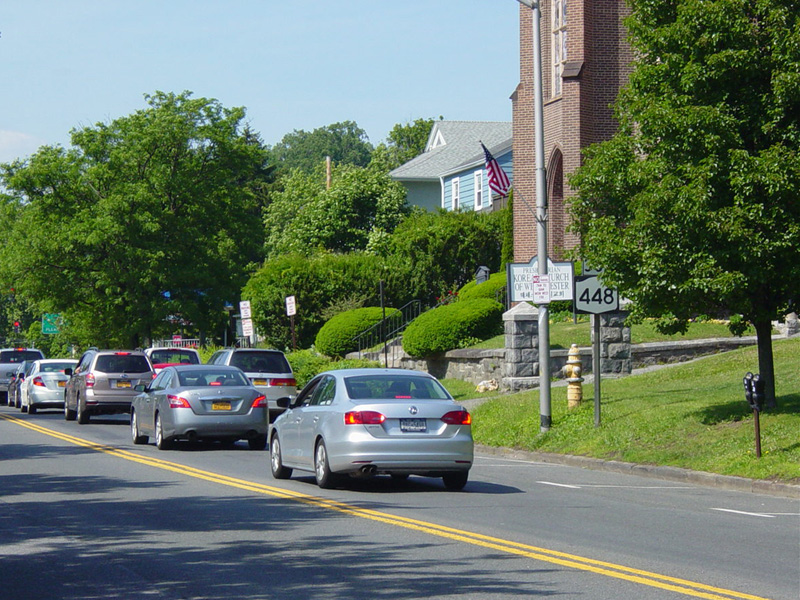 Bedford Road (NY 448) begins on the right at a traffic light. Bear left to stay on Broadway.