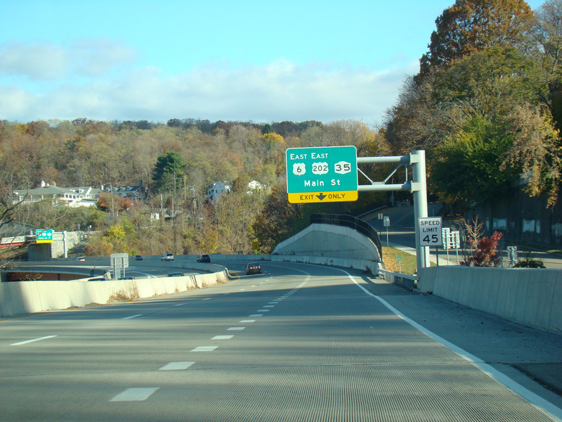 There is an exit for Main Street (US 6/US 202/NY 35) east. Westbound US 6 and US 202 are multiplexed with US 9 straight ahead. NY 35 begins at this exit.