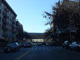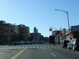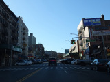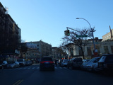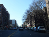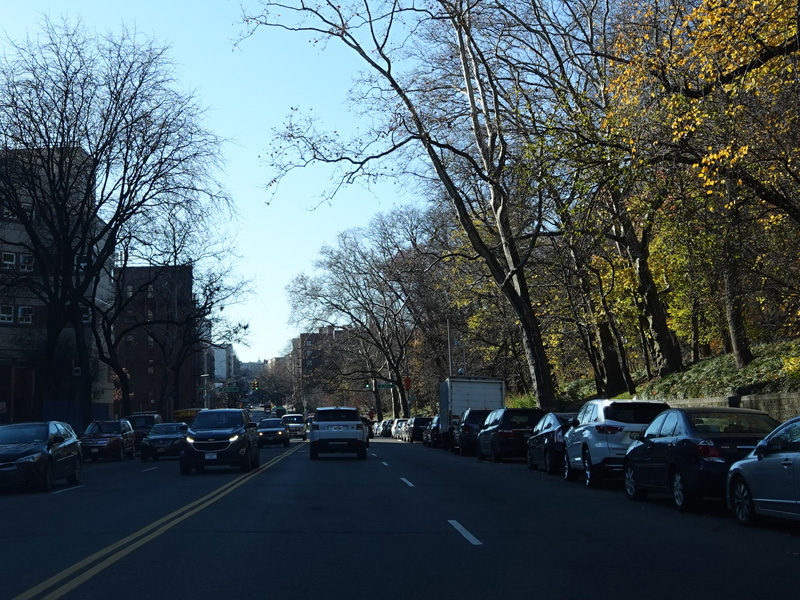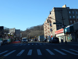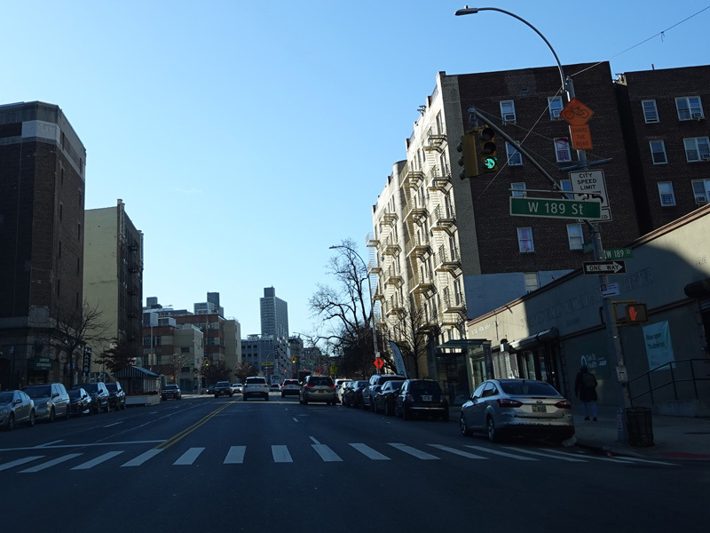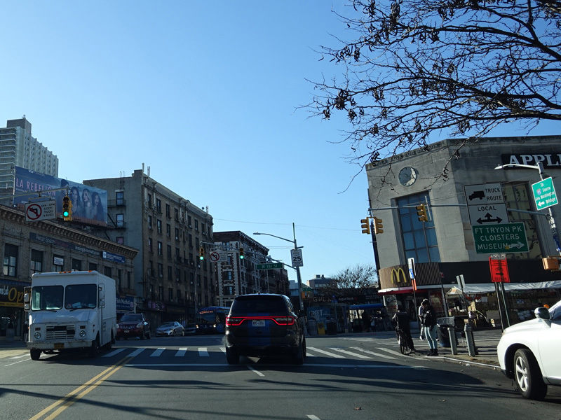 Broadway runs south through the Inwood section of Manhattan. There are traffic lights with oversized street name signs at West 204 Street, Academy Street, Cumming Street, Dyckman Street, Thayer Street, Arden Street, Dongan Place, West 196 Street, Bennett Avenue, West 193 Street, West 192 Street, Fairview Avenue, West 189 Street, West 187 Street, West 186 Street, and West 184 Street through West 180 Street.