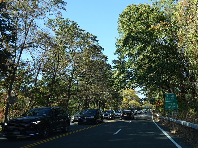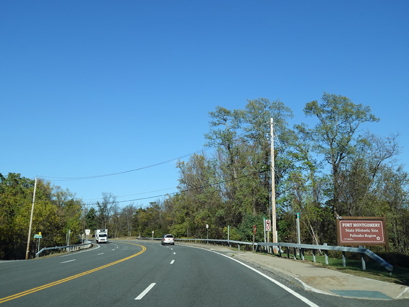 Welcome to Orange County! There is a traffic circle just past the county line. The Palisades Parkway has its northern terminus at the circle. US 6 west is routed along the parkway beginning here for a short distance. There is also access to the Bear Mountain Bridge (US 6/US 202). US 202 splits off from US 9W here and crosses the bridge, multiplexed with US 6, to Westchester County.