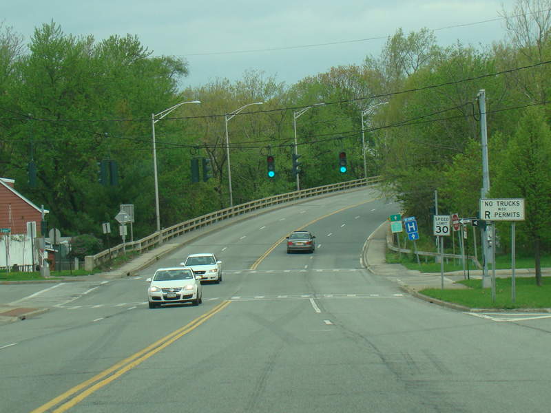 Quassaick Avenue continues north, crossing a small bridge over Quassaick Creek.