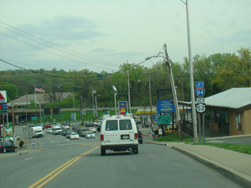 There is an interchange with I-84/NY 52. NY 32 splits off to the left onto North Plank Road.