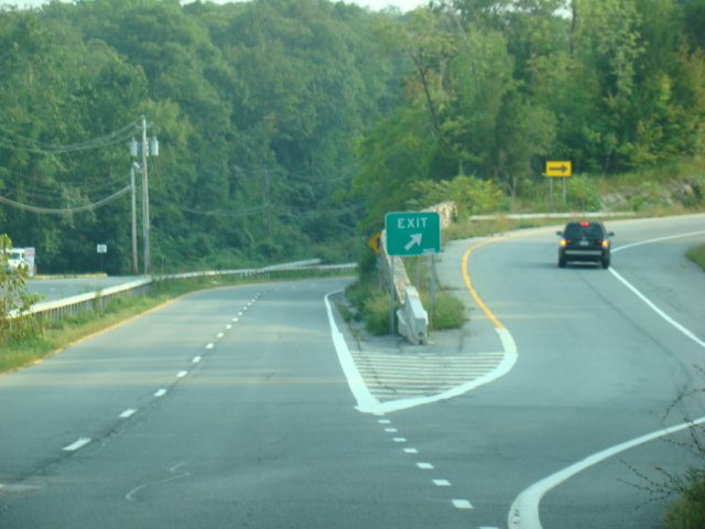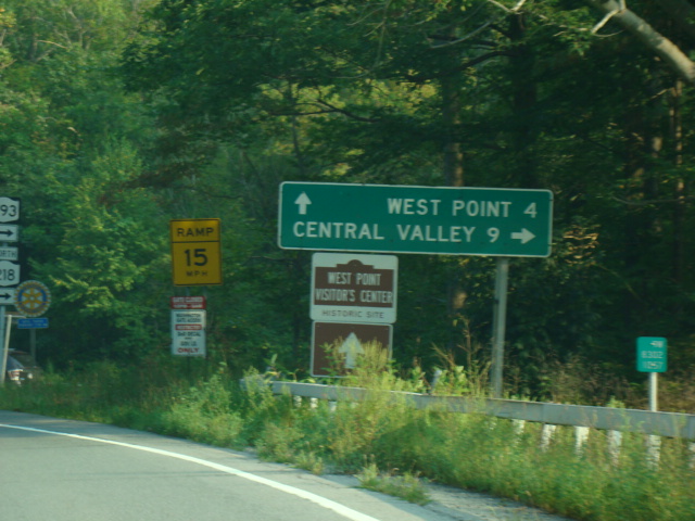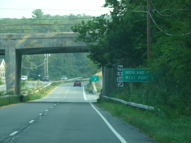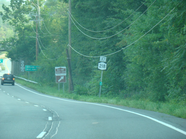 There is an exit for the Storm King Highway (NY 218) north and NY 293. Southbound NY 218 is multiplexed with US 9W straight ahead.