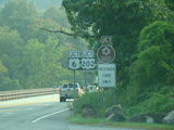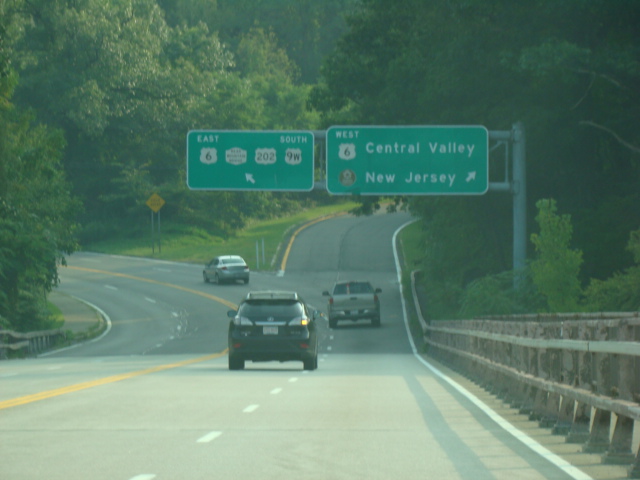 There is a traffic circle at Bear Mountain. The Palisades Parkway begins here. Westbound US 6 is routed along the parkway south. Continue around the circle for the Bear Mountain Bridge (US 6/US 202). Westbound US 202 is multiplexed with US 9W straight ahead.