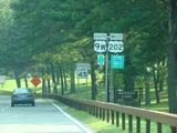 South of the traffic circle, westbound US 202 is multiplexed with US 9W south. The road narrows down to two lanes. Hessian Lake is to the right.