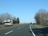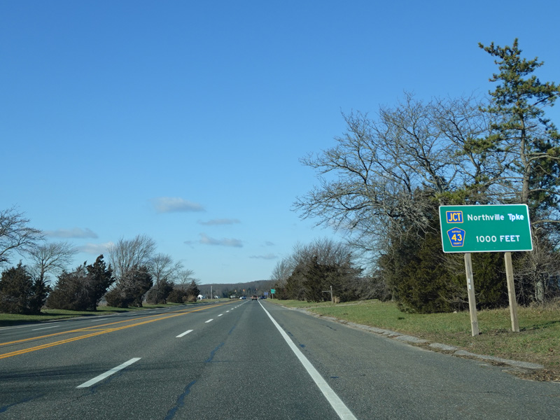 The median ends. There is a traffic light at Northville Turnpike (CR 43). Turn right to go north or left to go south.