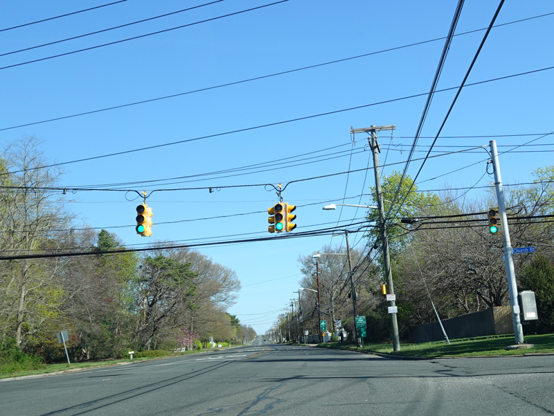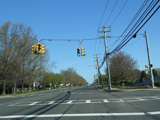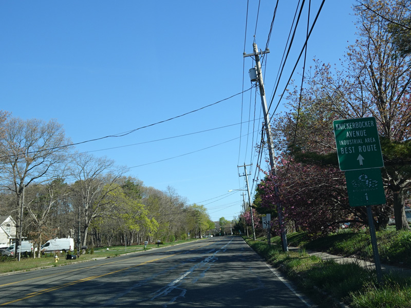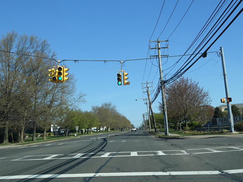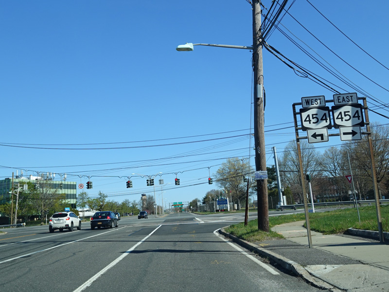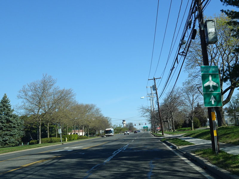 Johnson Avenue ends at a traffic light at Veterans Highway (NY 454). Turn right to go east or left to go west. The entrance to Long Island MacArthur Airport is straight ahead.