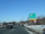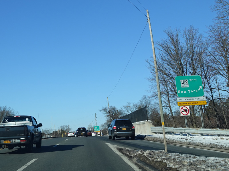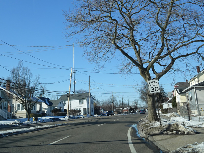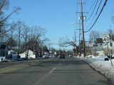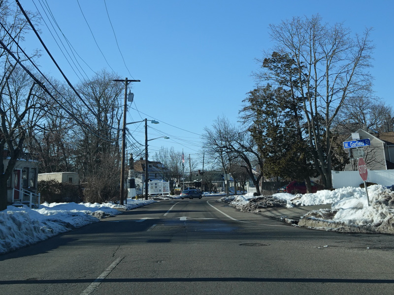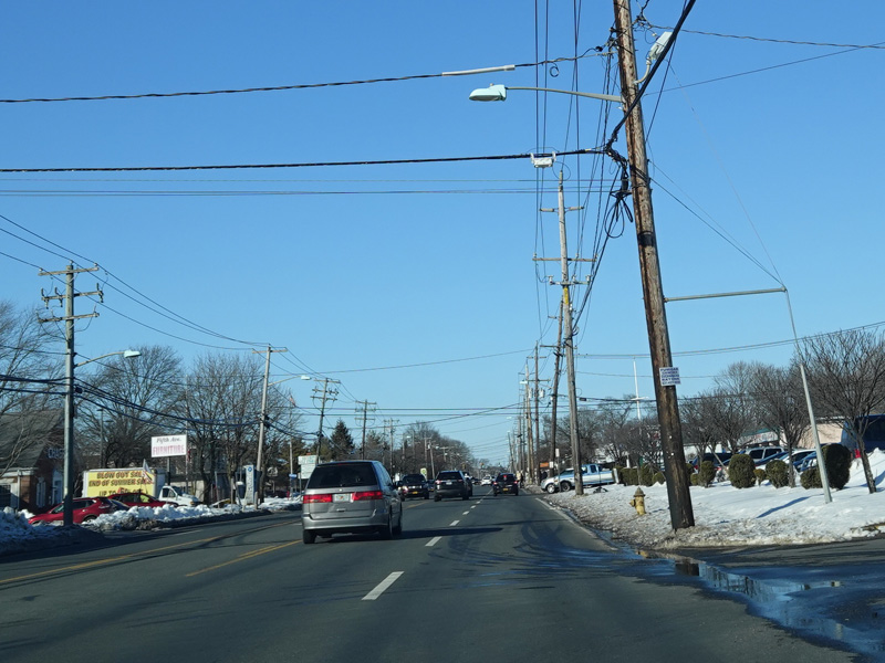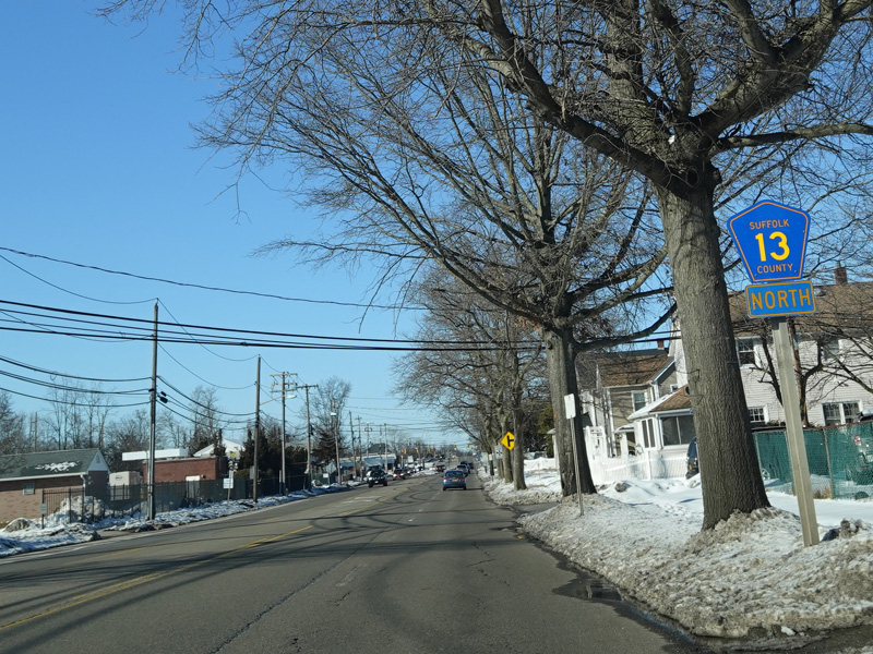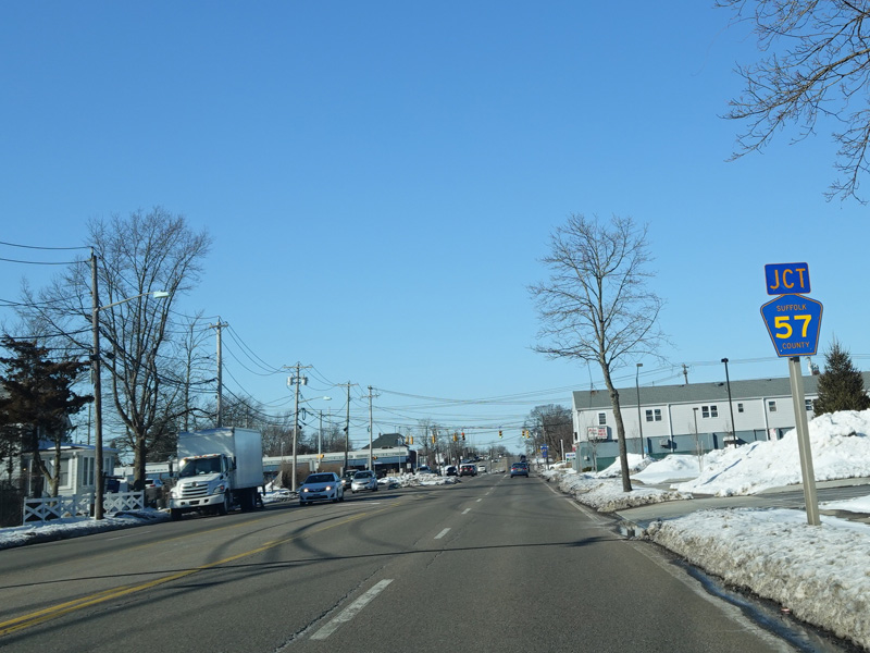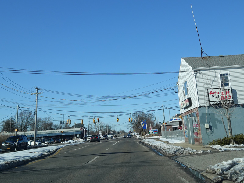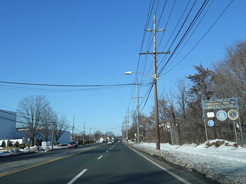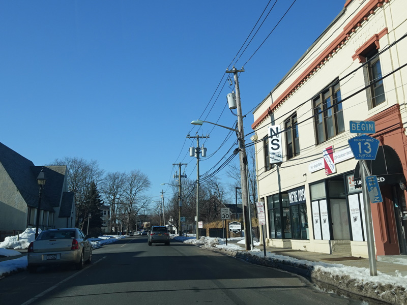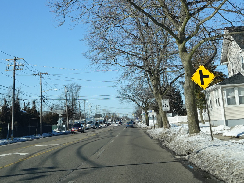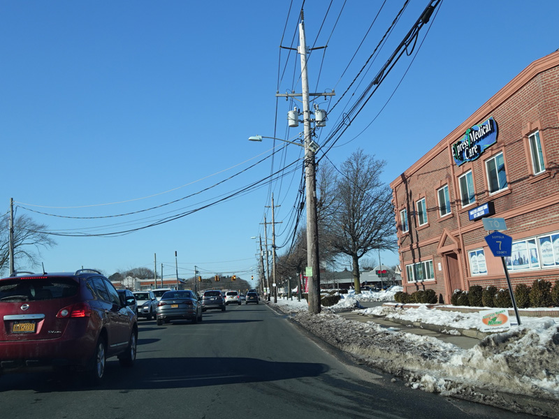 Fifth Avenue begins at Montauk Highway (NY 27A) in Bay Shore. At first, it is a northbound one-way street with a single lane.