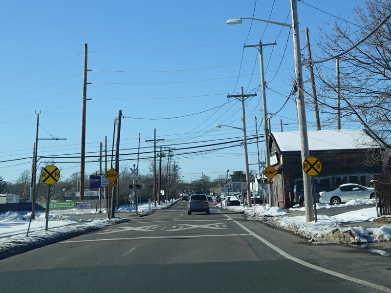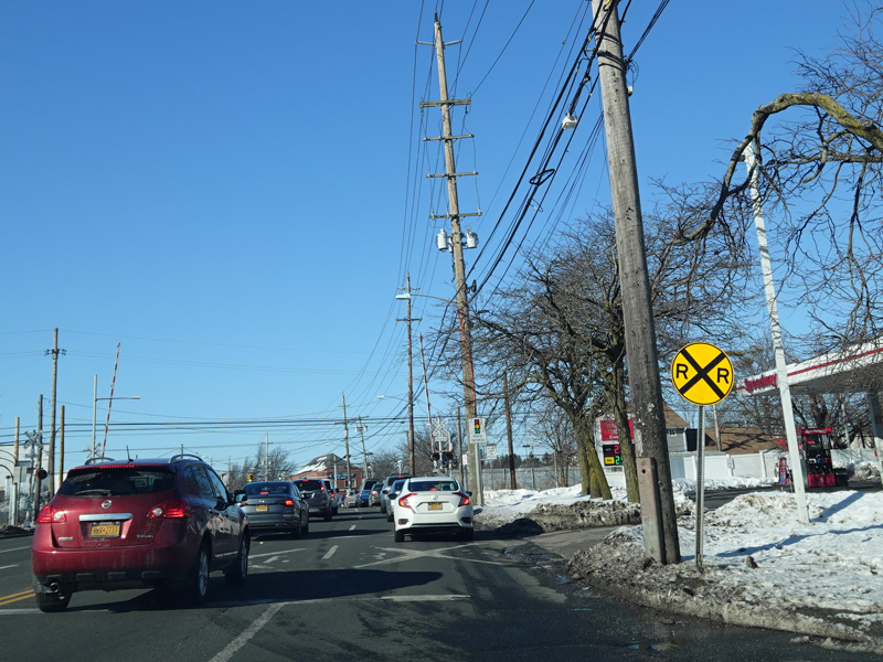 There is a railroad crossing at the Montauk Branch of the Long Island Rail Road.