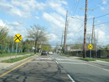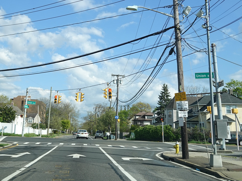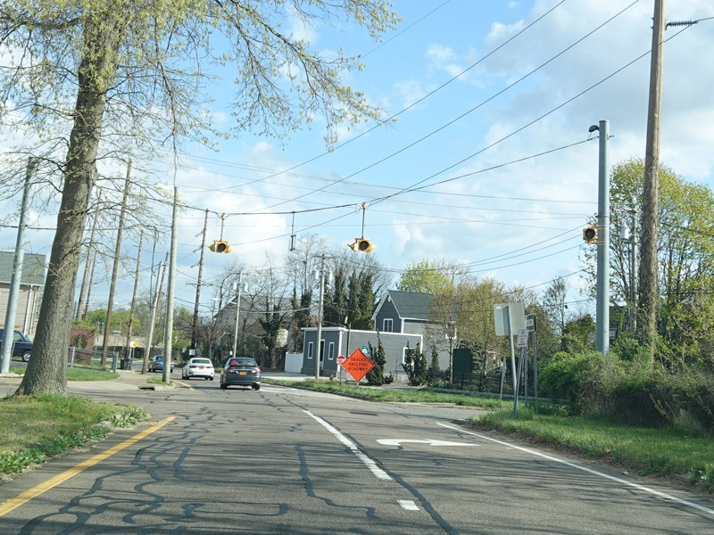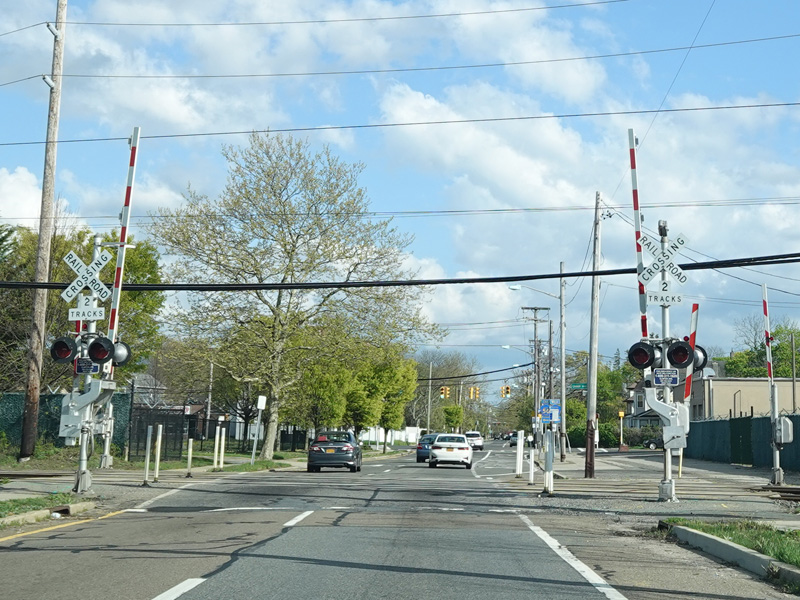 There is a railroad crossing, immediately followed by a traffic light at Union Boulevard (CR 50). Turn left to go east or right to go west.