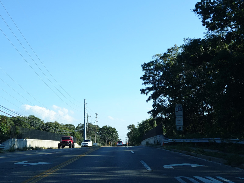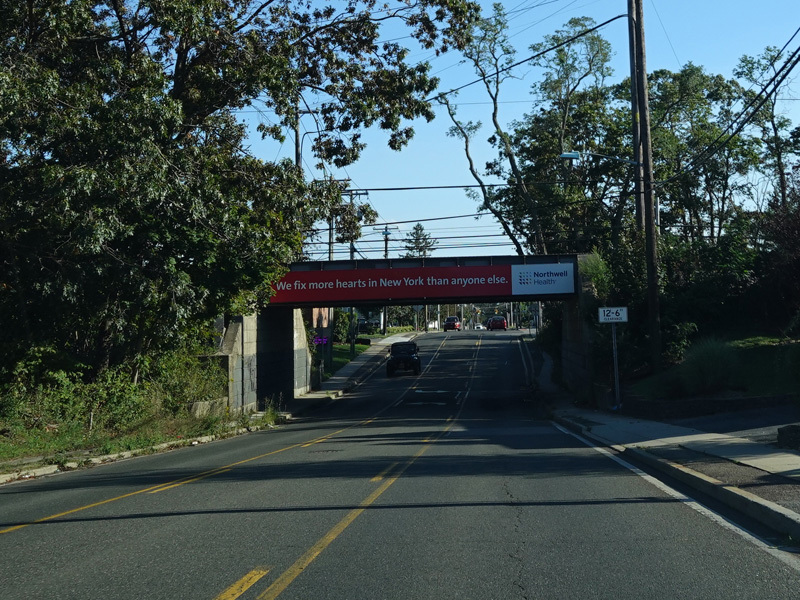 Carleton Avenue continues south as a two-lane undivided road, passing under the Montauk Branch of the Long Island Rail Road.