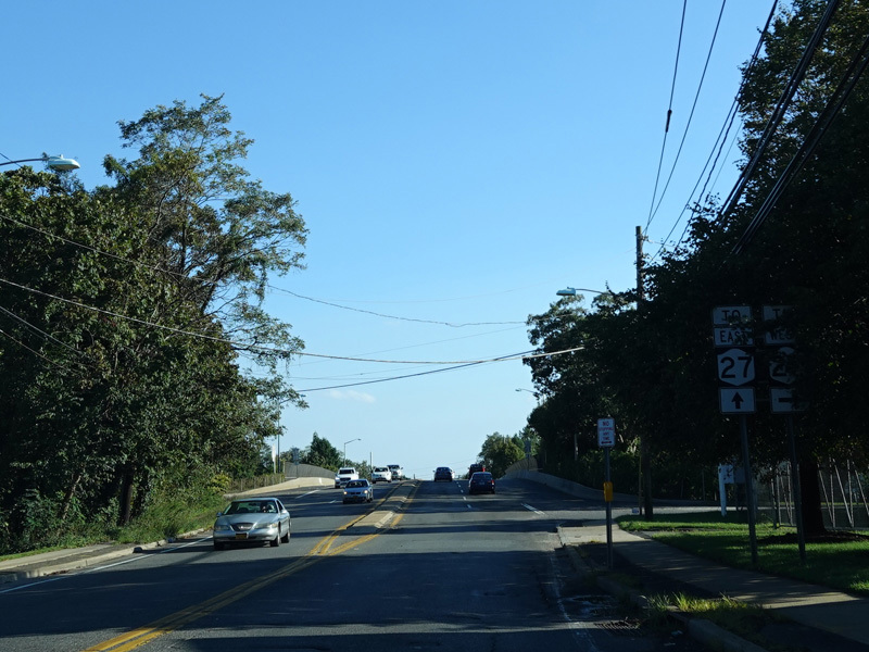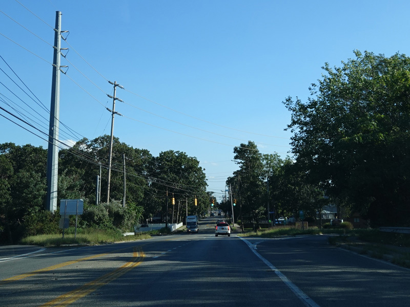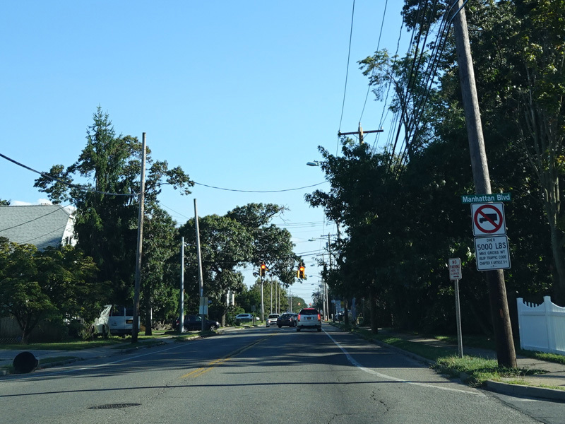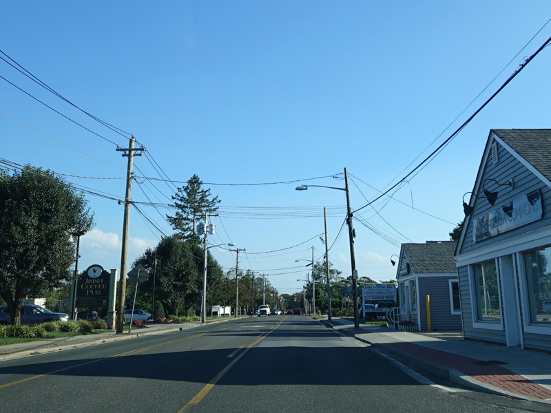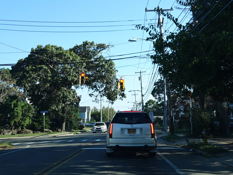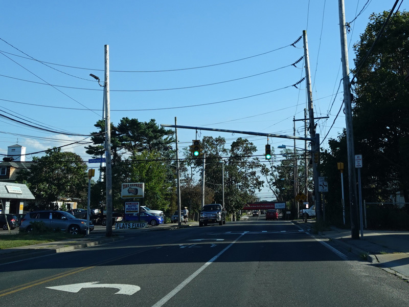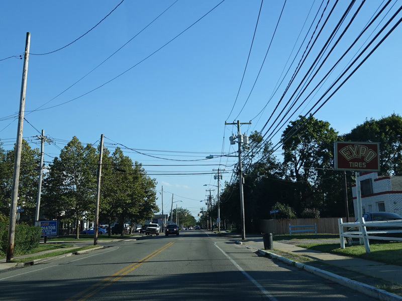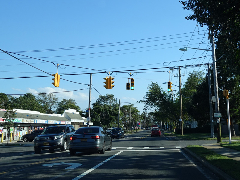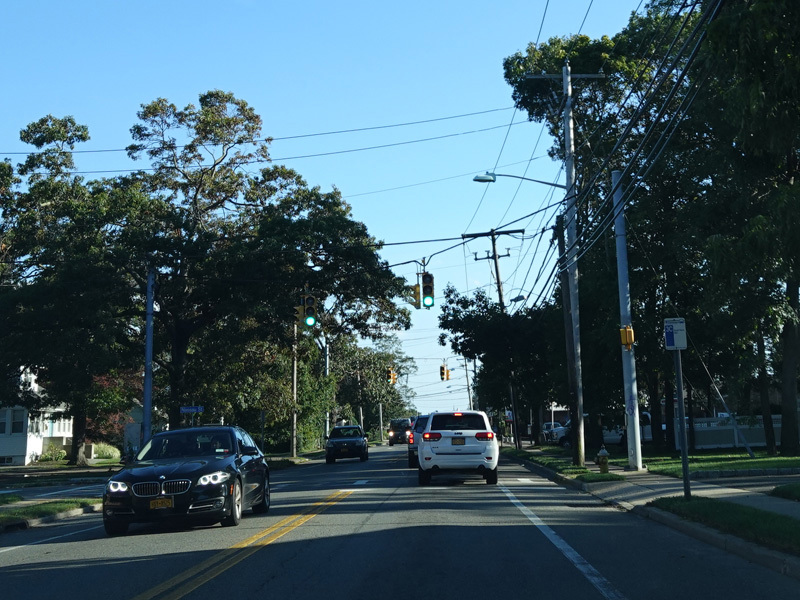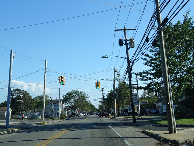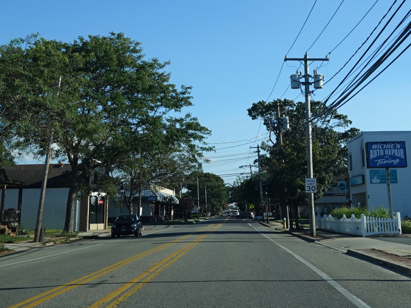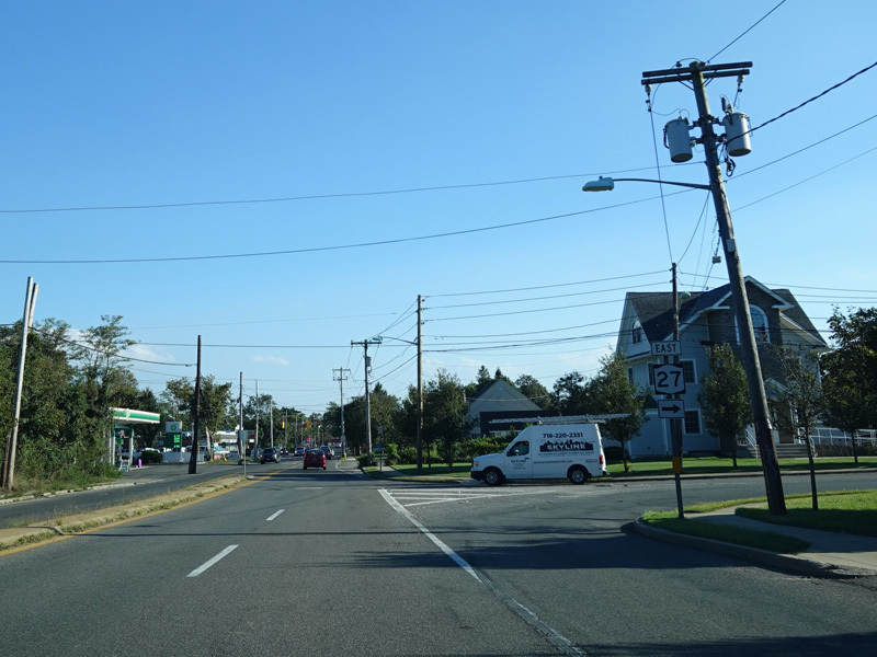 Carleton Avenue ends at a traffic light at Montauk Highway (NY 27A). Turn left to go east or right to go west.
