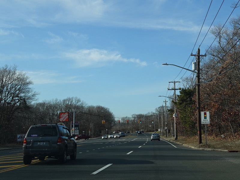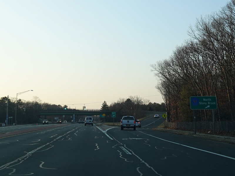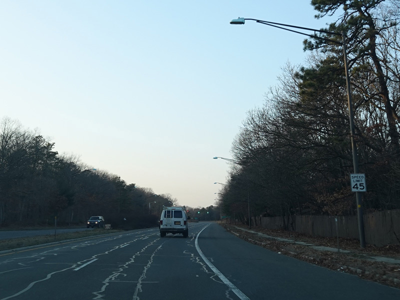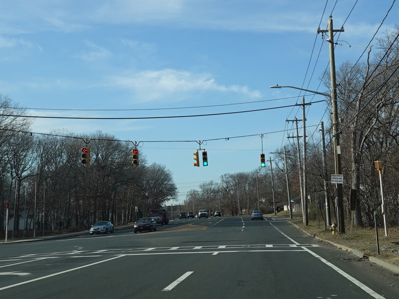 Patchogue-Holbrook Road becomes a divided highway with a grass median. There are traffic lights at Broadway Avenue and Furrows Road.