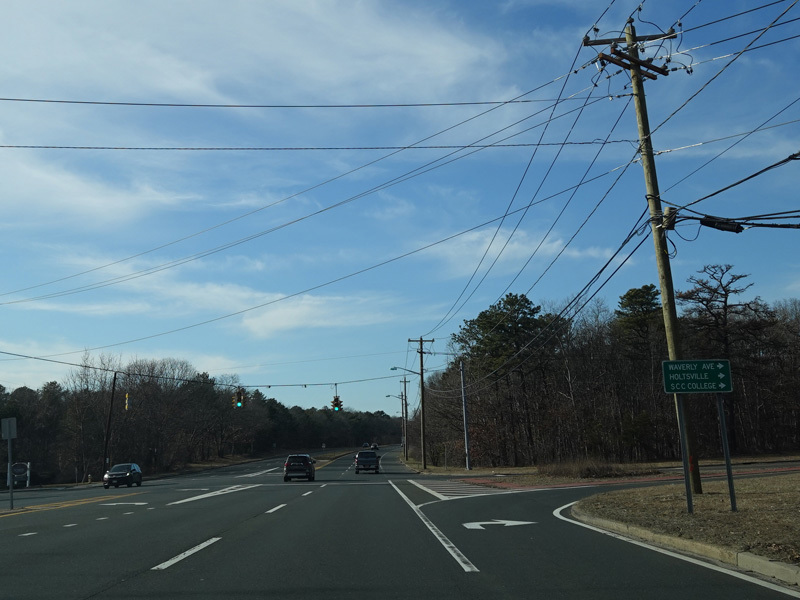Waverly Avenue splits off to the right as this traffic light as CR 61, an unsigned designation. CR 19 continues straight ahead as Patchogue-Holbrook Road.