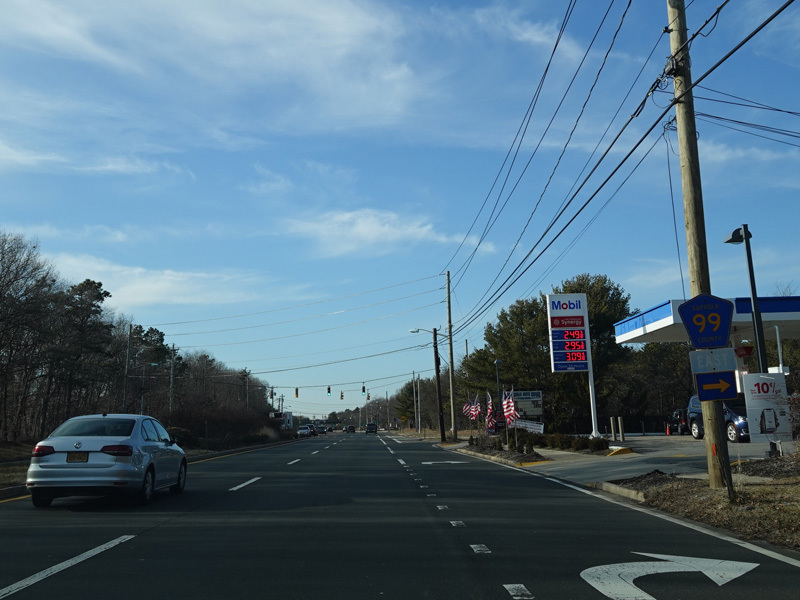 Woodside Avenue (CR 99) begins on the right at a traffic light.